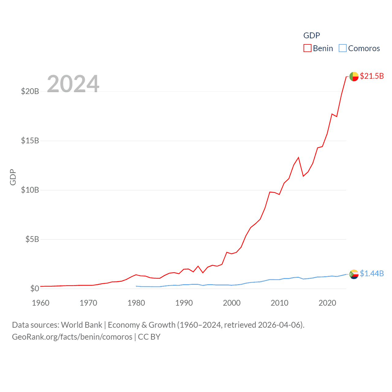 By GDP, Benin ranks 126/197 ($21.5B) and Comoros ranks 183/197 ($1.44B). By GDP per capita, Benin ranks 162/197 ($1,485), while Comoros ranks 161/197 ($1,663).