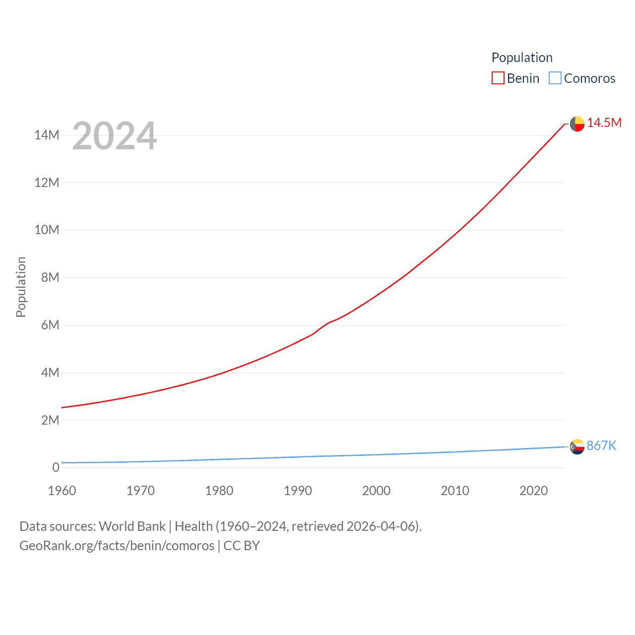 Benin has a population of 14.5M (ranked 76/197), compared with 867K in Comoros (ranked 160/197). Benin's land area is 43,537 sq mi versus 719 sq mi for Comoros (ranked 99th vs. 171st).