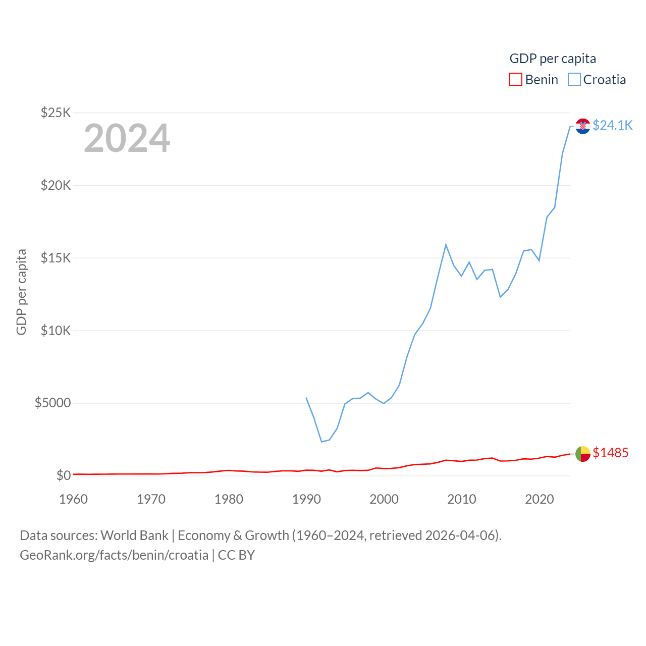 By GDP, Benin ranks 126/197 ($21.5B) and Croatia ranks 75/197 ($93B). By GDP per capita, Benin ranks 162/197 ($1,485), while Croatia ranks 50/197 ($24,050).