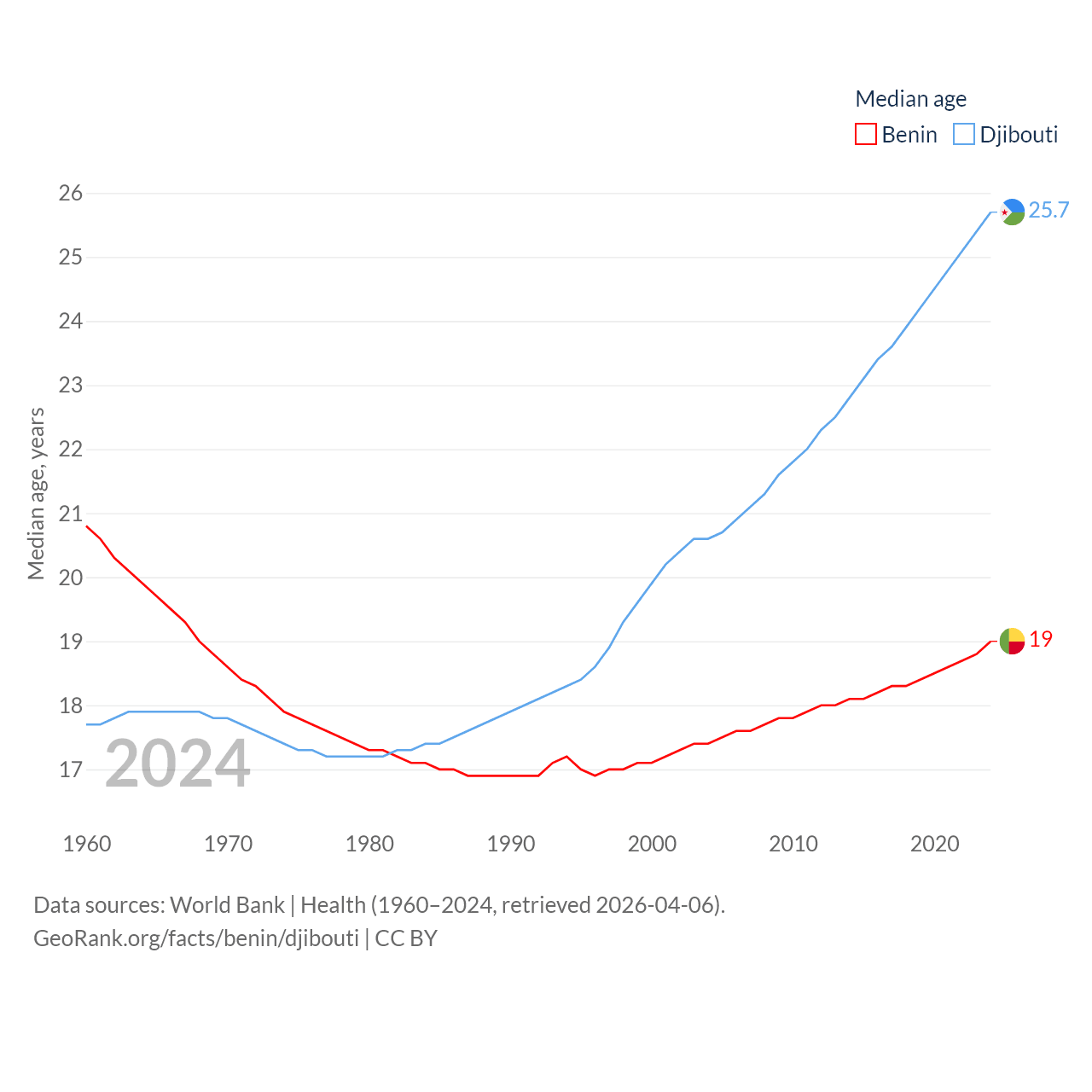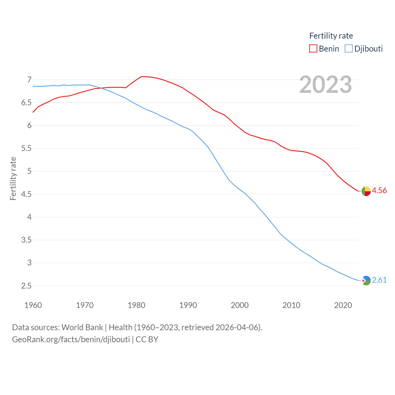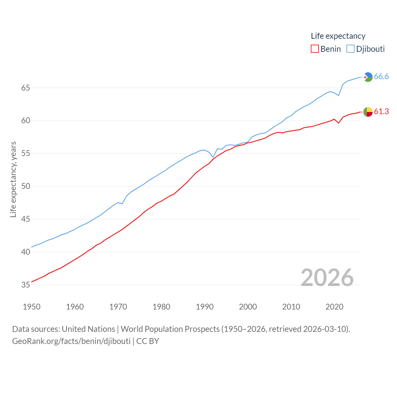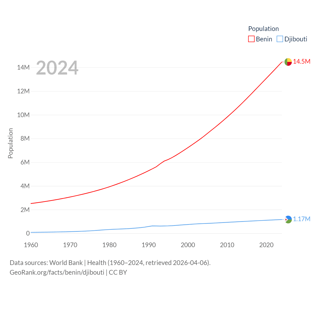 Benin has a population of 14.5M (ranked 76/197), compared with 1.17M in Djibouti (ranked 158/197). Benin's land area is 43,537 sq mi versus 8,950 sq mi for Djibouti (ranked 99th vs. 147th).