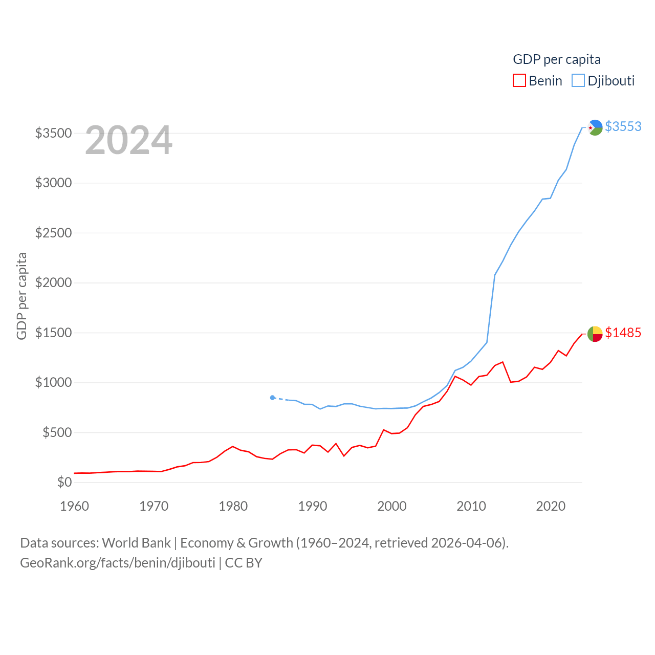 By GDP, Benin ranks 126/197 ($21.5B) and Djibouti ranks 165/197 ($4.15B). By GDP per capita, Benin ranks 162/197 ($1,485), while Djibouti ranks 133/197 ($3,553).