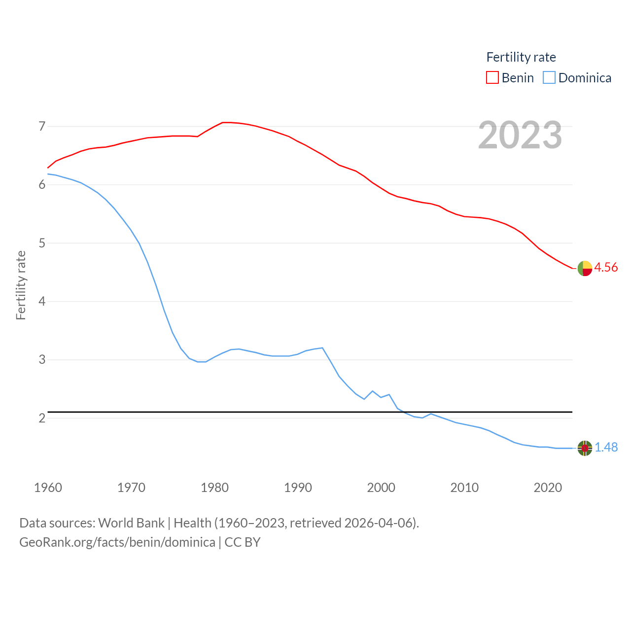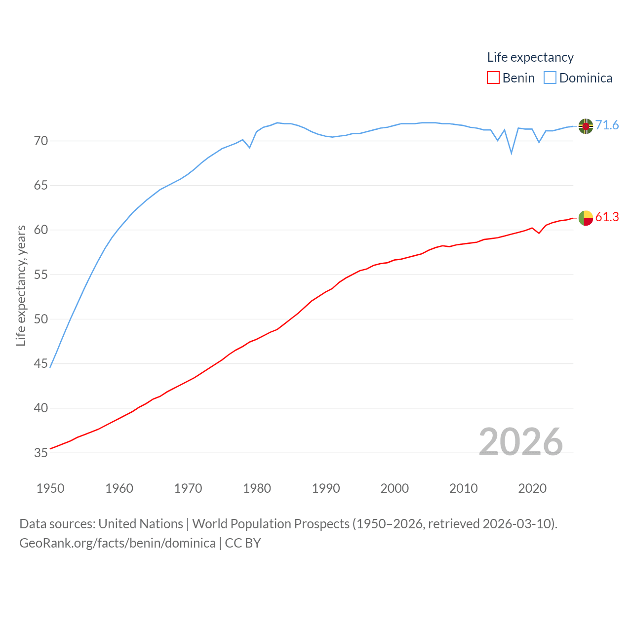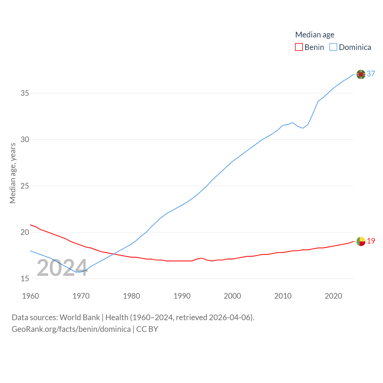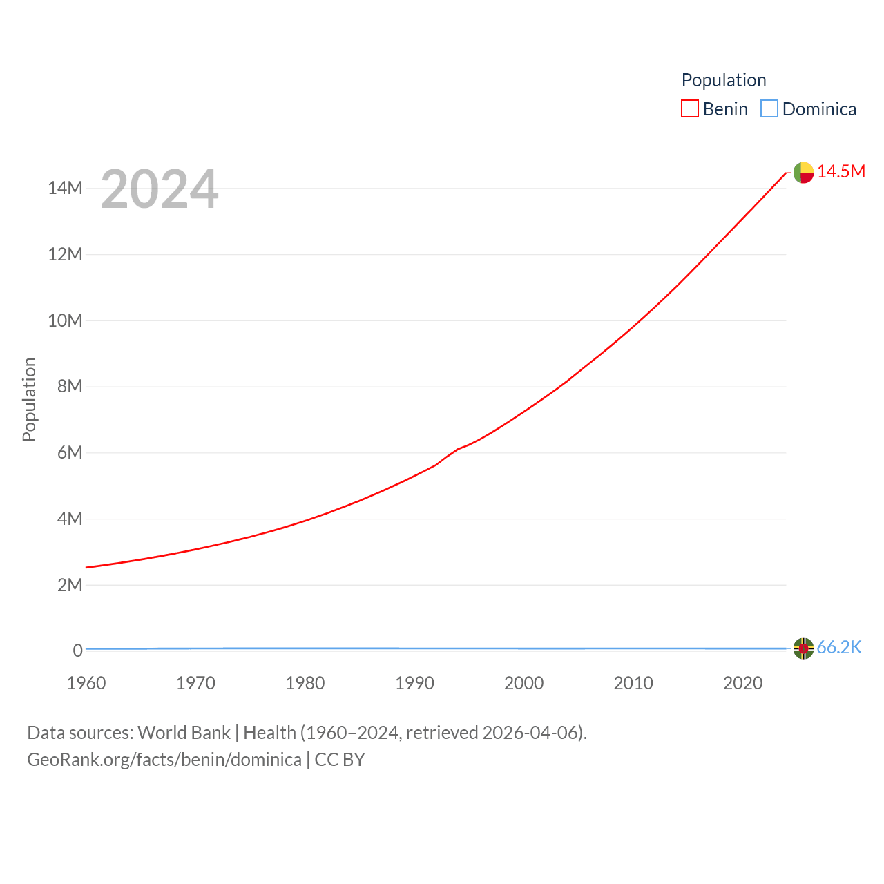 Benin has a population of 14.5M (ranked 76/197), compared with 66.2K in Dominica (ranked 188/197). Benin's land area is 43,537 sq mi versus 289.6 sq mi for Dominica (ranked 99th vs. 175th).