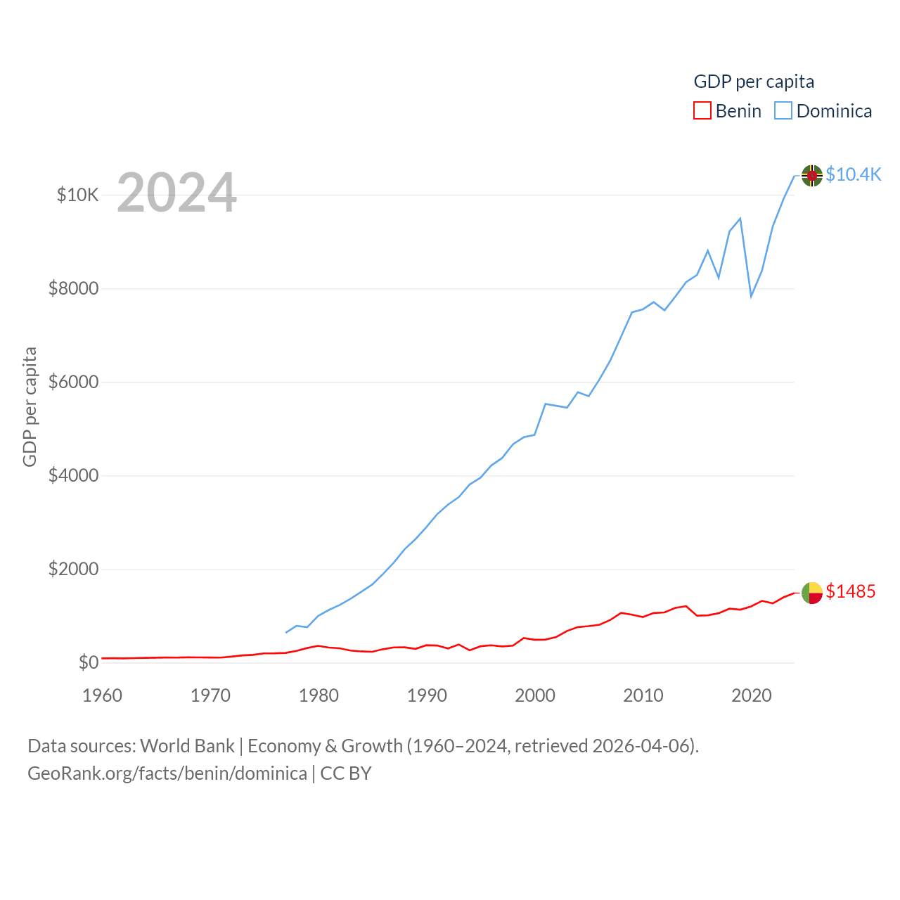 By GDP, Benin ranks 126/197 ($21.5B) and Dominica ranks 190/197 ($689M). By GDP per capita, Benin ranks 162/197 ($1,485), while Dominica ranks 84/197 ($10,405).