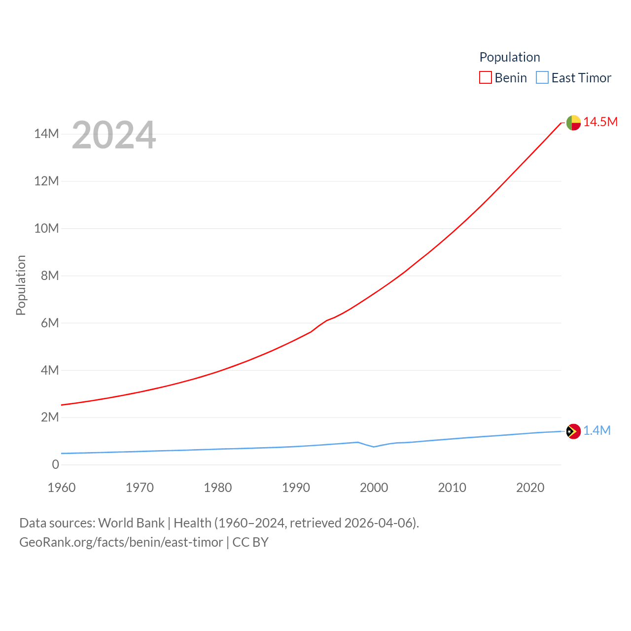 Benin has a population of 14.5M (ranked 76/197), compared with 1.4M in East Timor (ranked 152/197). Benin's land area is 43,537 sq mi versus 5,741 sq mi for East Timor (ranked 99th vs. 155th).