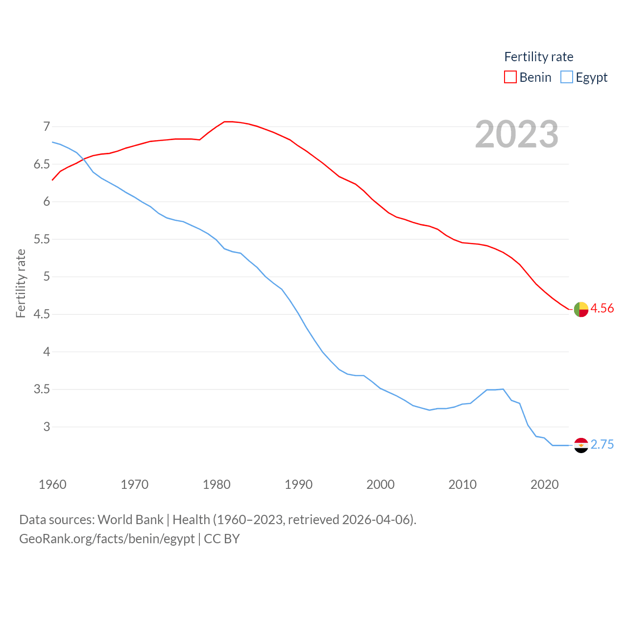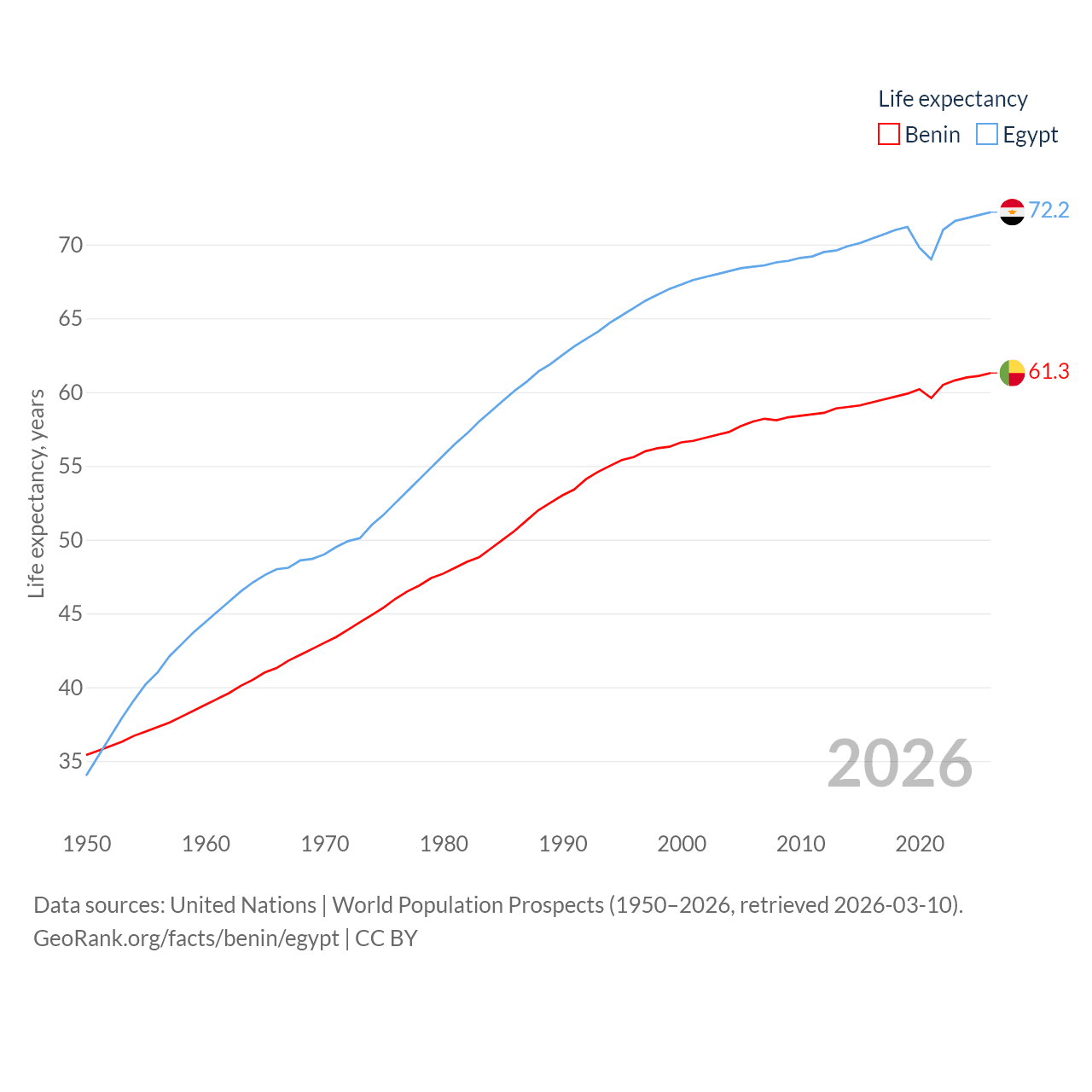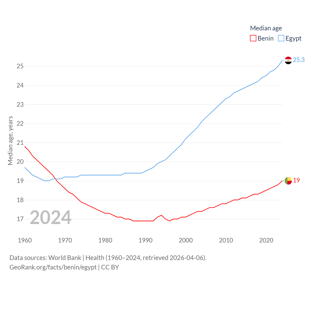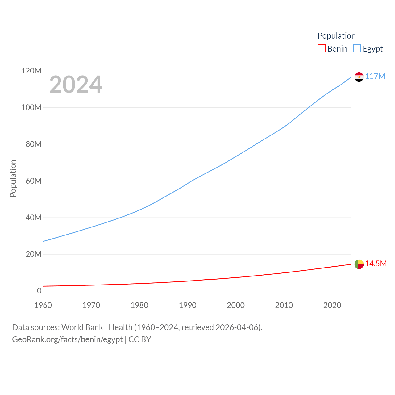 Benin has a population of 14.5M (ranked 76/197), compared with 117M in Egypt (ranked 13/197). Benin's land area is 43,537 sq mi versus 384,345 sq mi for Egypt (ranked 99th vs. 29th).