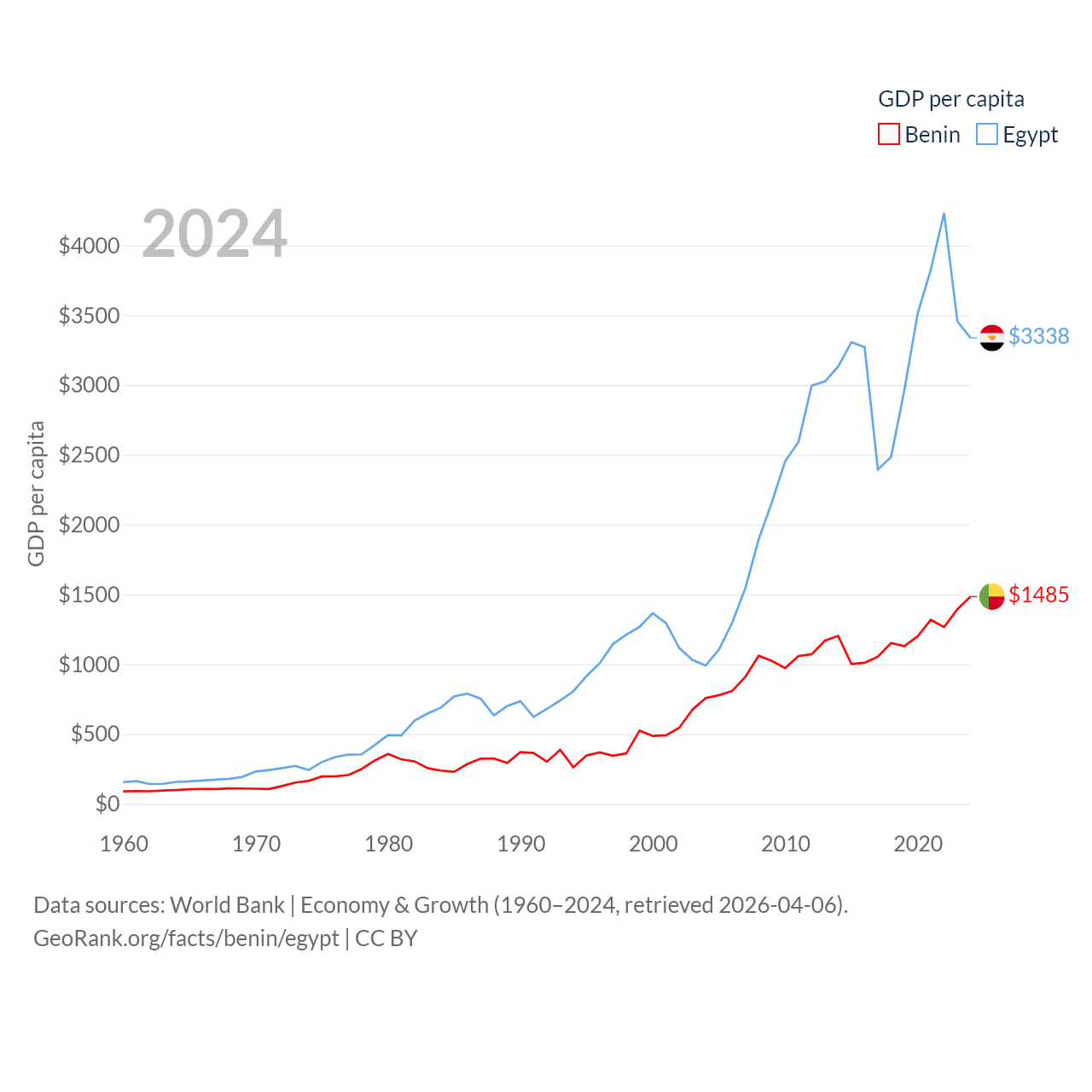 By GDP, Benin ranks 126/197 ($21.5B) and Egypt ranks 41/197 ($389B). By GDP per capita, Benin ranks 162/197 ($1,485), while Egypt ranks 138/197 ($3,338).