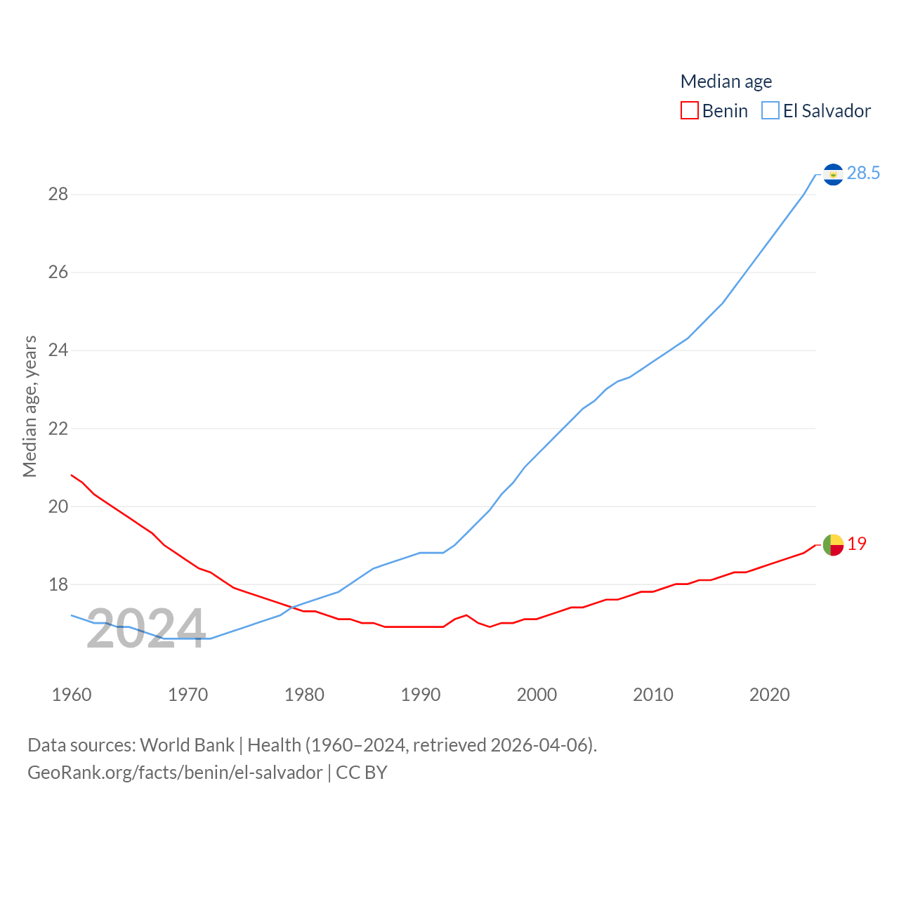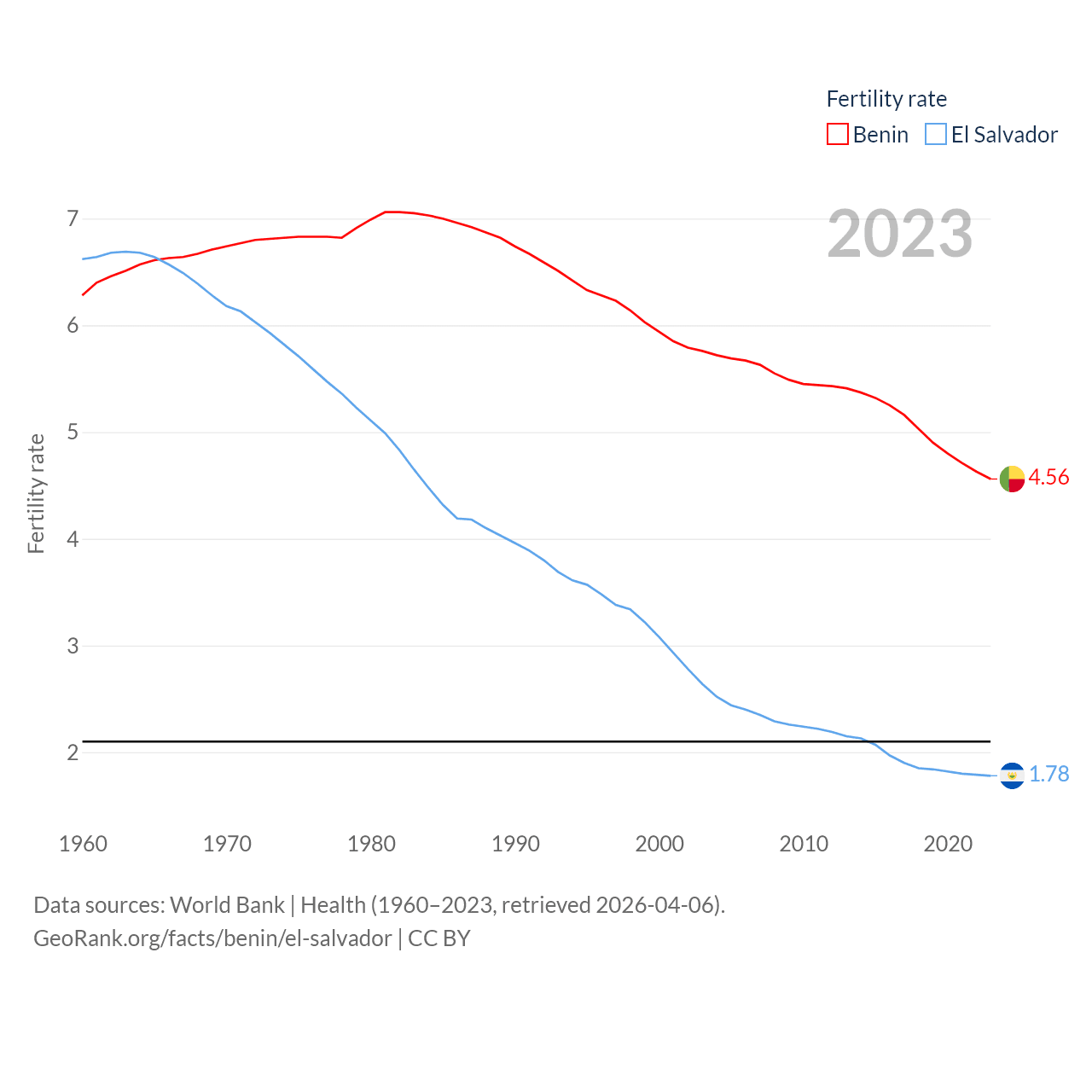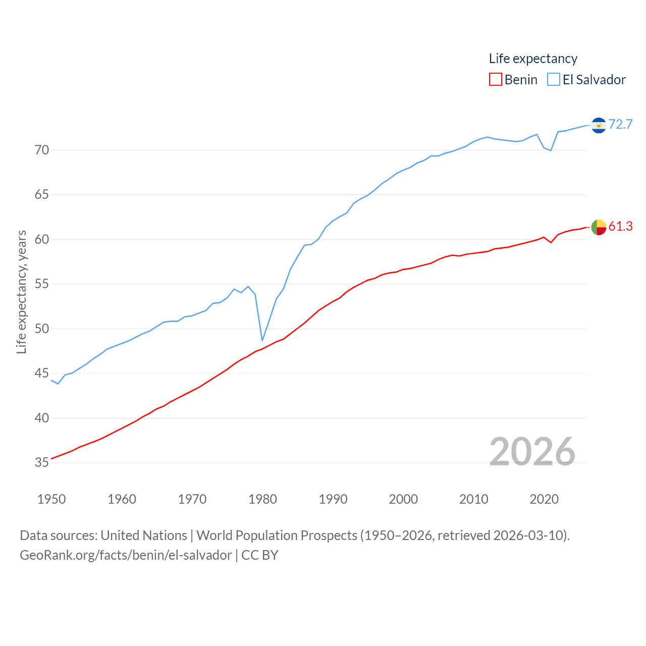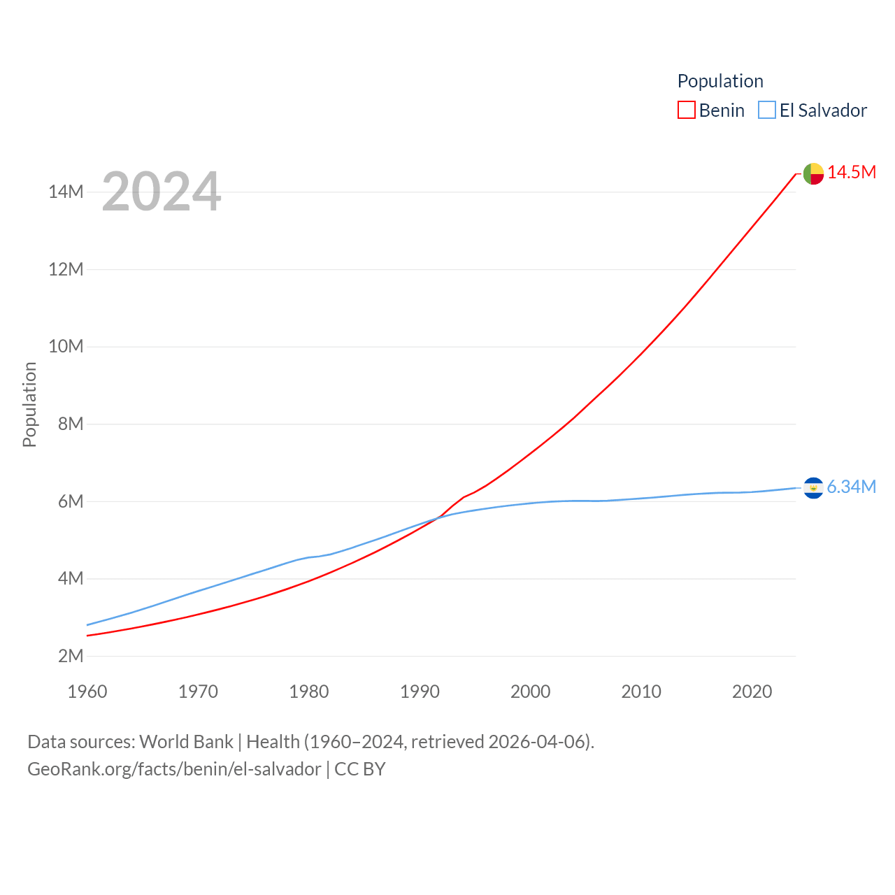 Benin has a population of 14.5M (ranked 76/197), compared with 6.34M in El Salvador (ranked 111/197). Benin's land area is 43,537 sq mi versus 8,000 sq mi for El Salvador (ranked 99th vs. 150th).