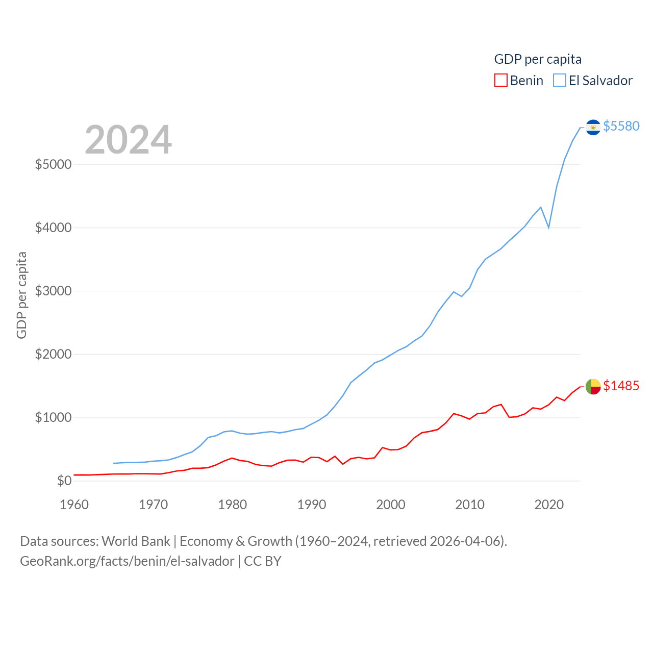 By GDP, Benin ranks 126/197 ($21.5B) and El Salvador ranks 105/197 ($35.4B). By GDP per capita, Benin ranks 162/197 ($1,485), while El Salvador ranks 116/197 ($5,580).