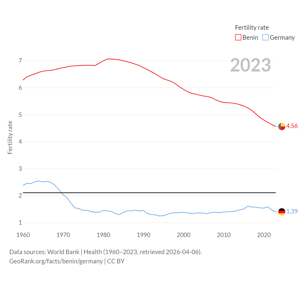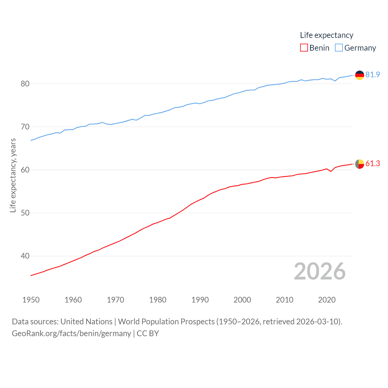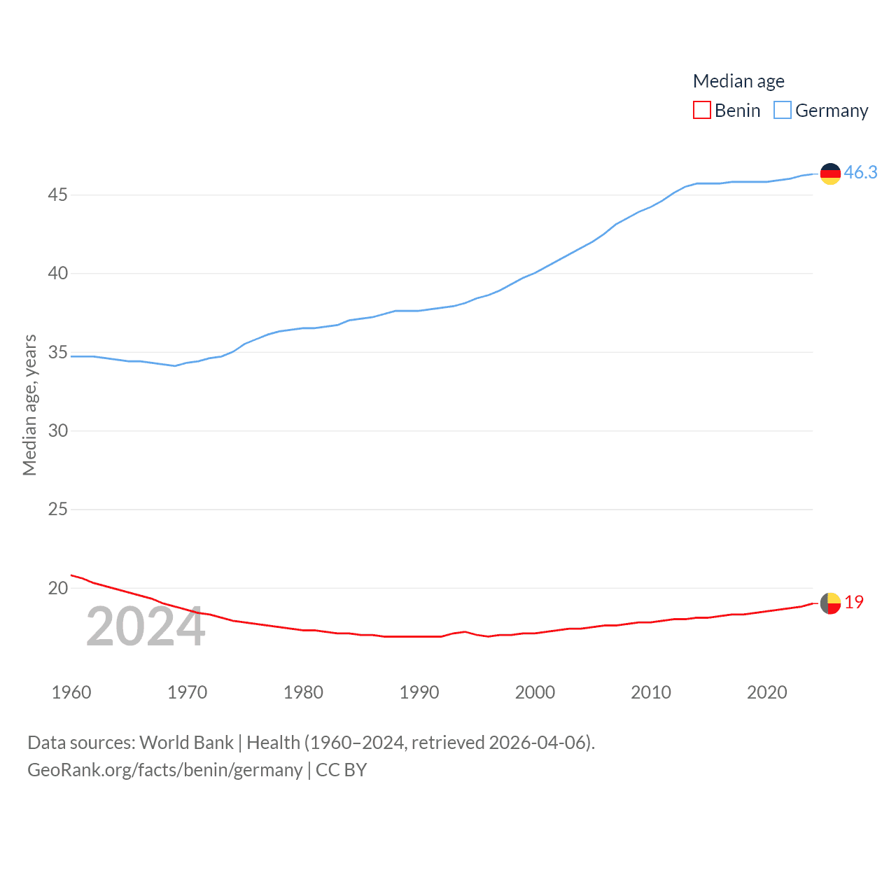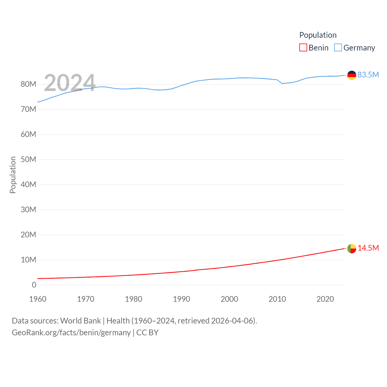 Benin has a population of 14.5M (ranked 76/197), compared with 83.5M in Germany (ranked 19/197). Benin's land area is 43,537 sq mi versus 134,916 sq mi for Germany (ranked 99th vs. 63rd).