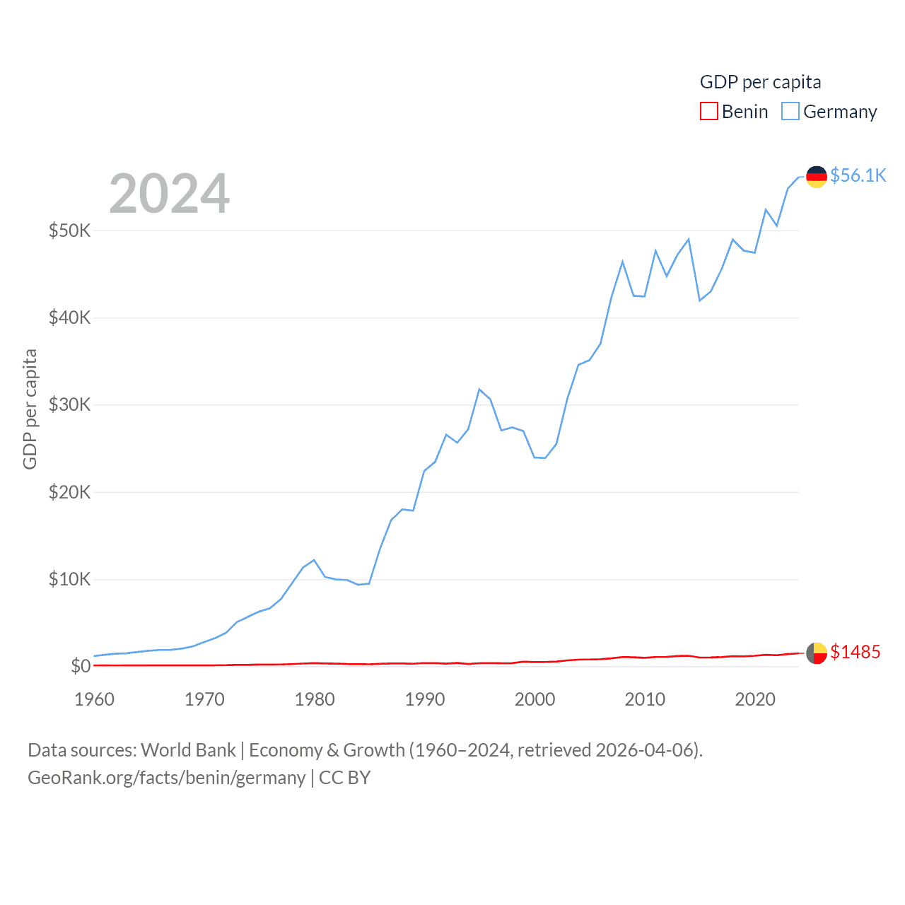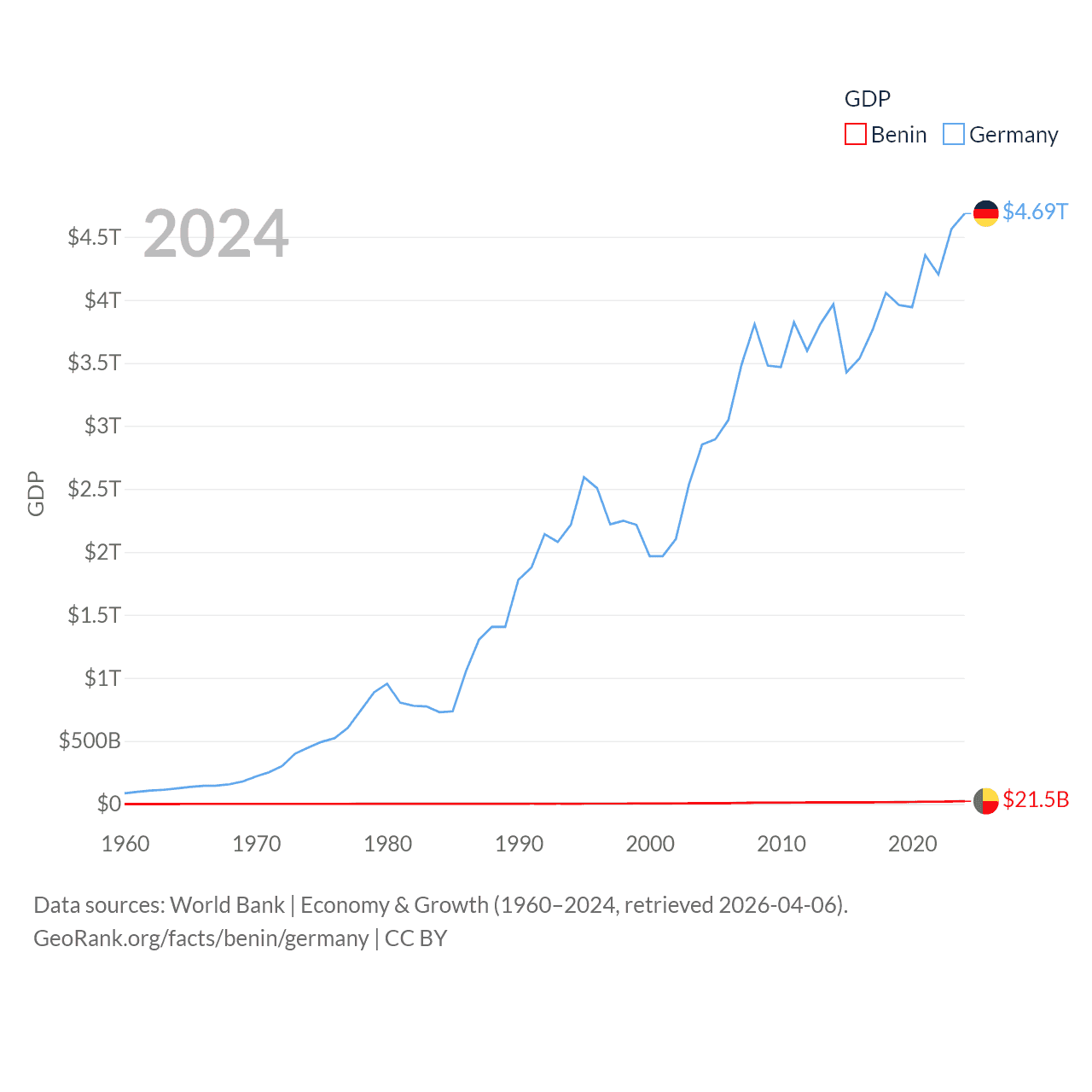 By GDP, Benin ranks 126/197 ($21.5B) and Germany ranks 3/197 ($4.69T). By GDP per capita, Benin ranks 162/197 ($1,485), while Germany ranks 19/197 ($56,104).