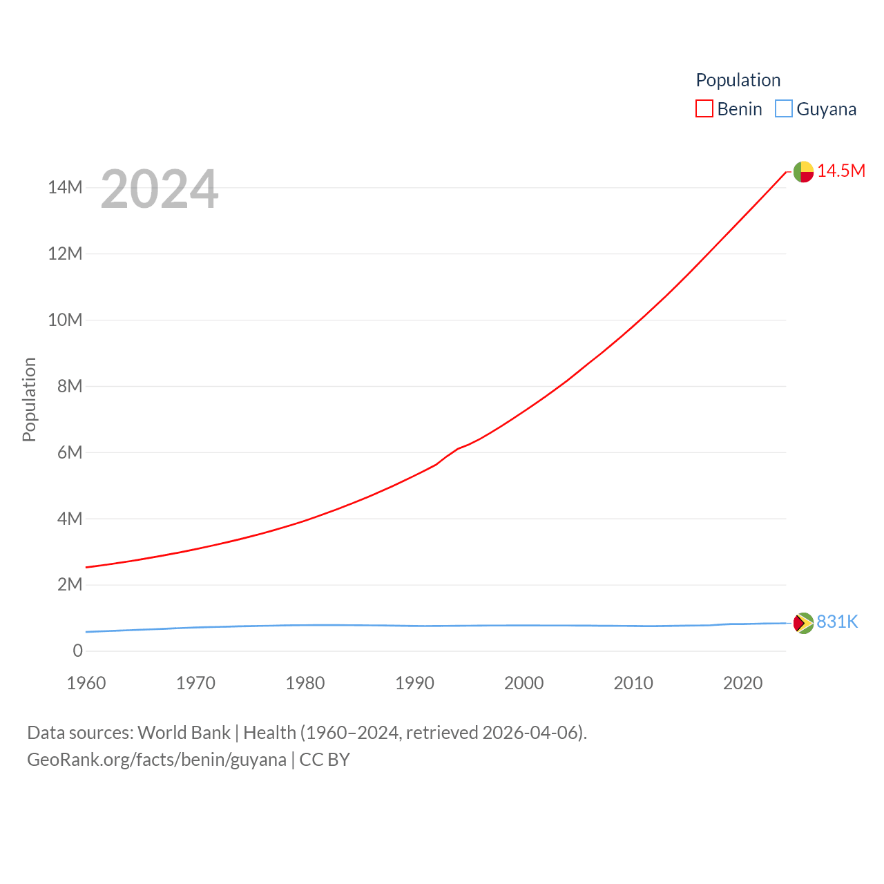 Benin has a population of 14.5M (ranked 76/197), compared with 831K in Guyana (ranked 161/197). Benin's land area is 43,537 sq mi versus 81,522 sq mi for Guyana (ranked 99th vs. 82nd).