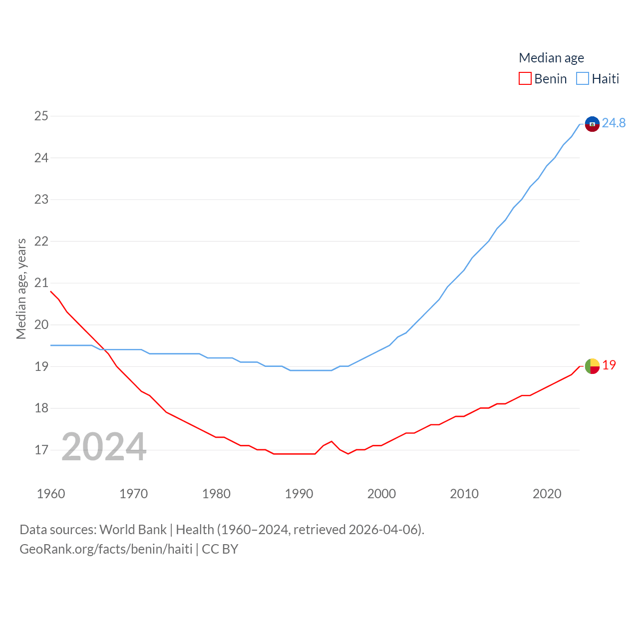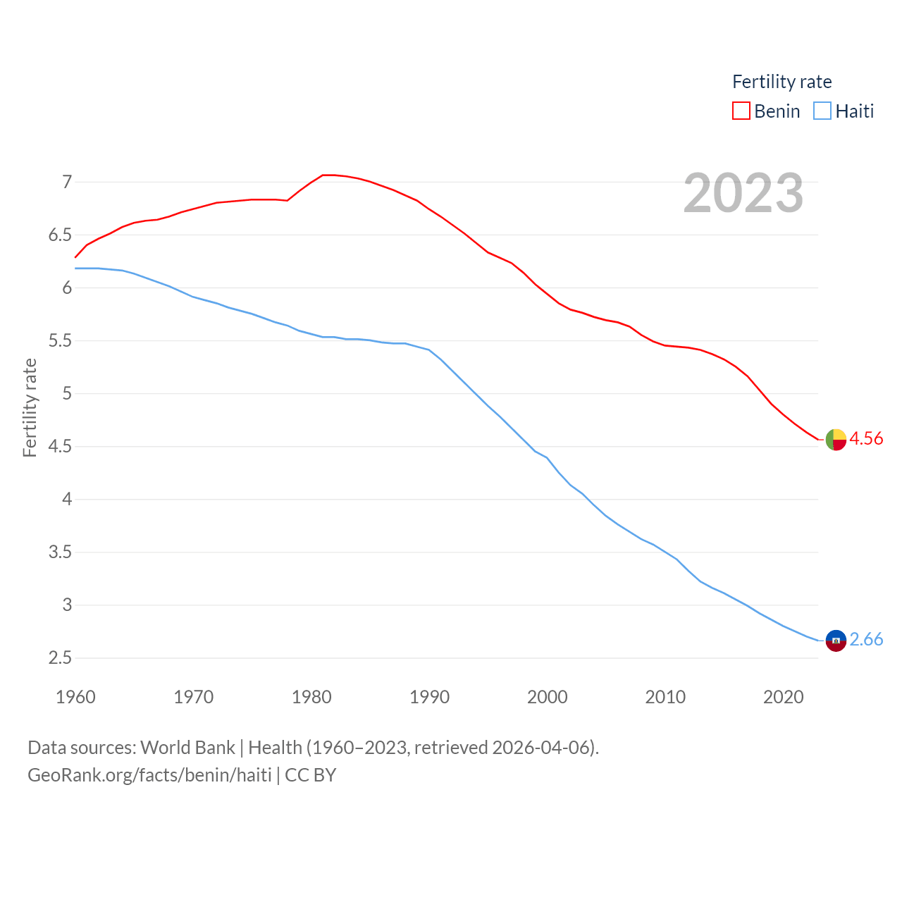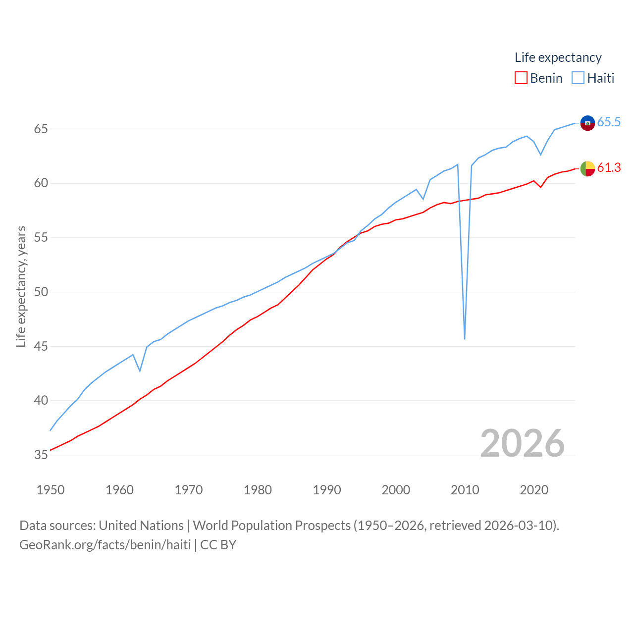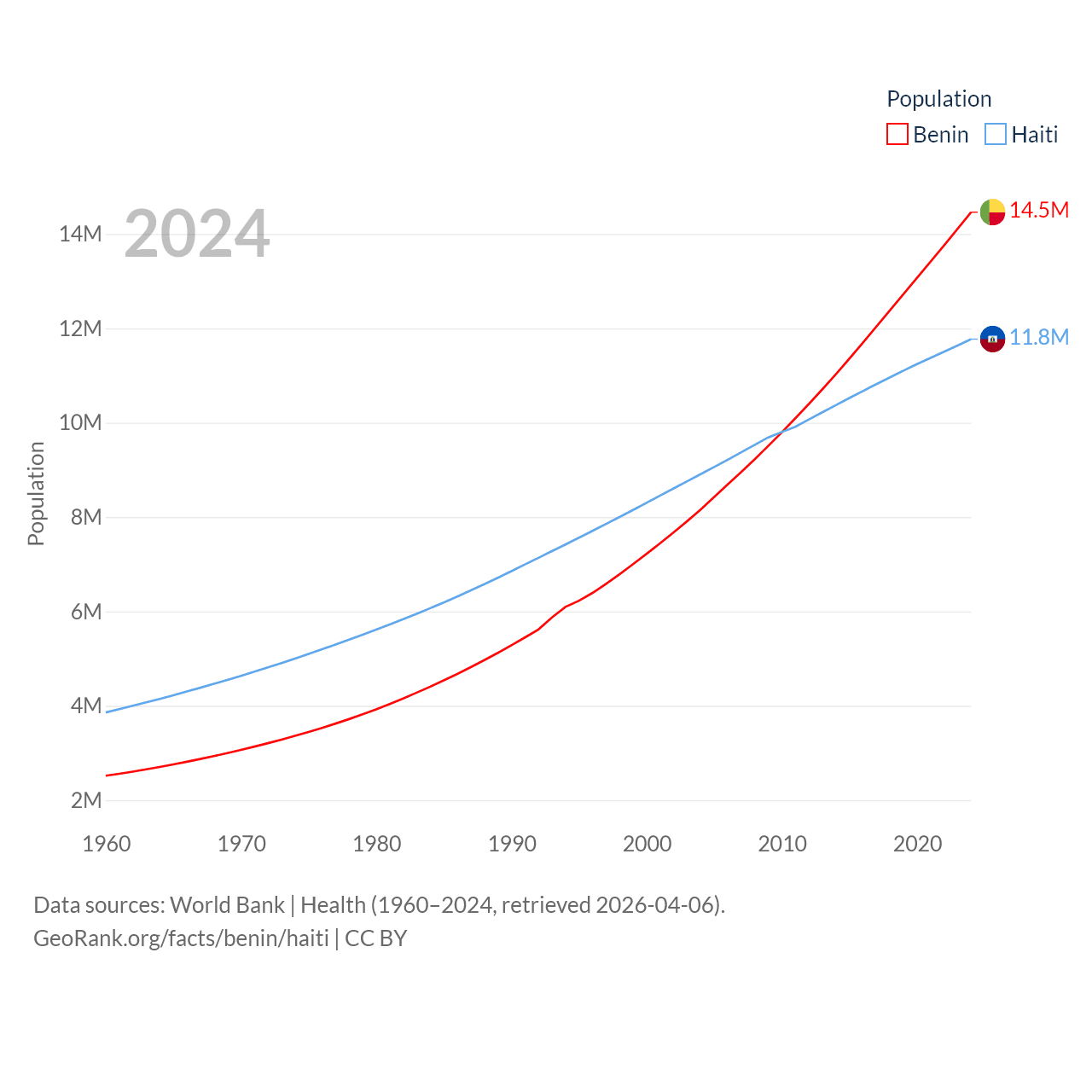 Benin has a population of 14.5M (ranked 76/197), compared with 11.8M in Haiti (ranked 83/197). Benin's land area is 43,537 sq mi versus 10,641 sq mi for Haiti (ranked 99th vs. 142nd).