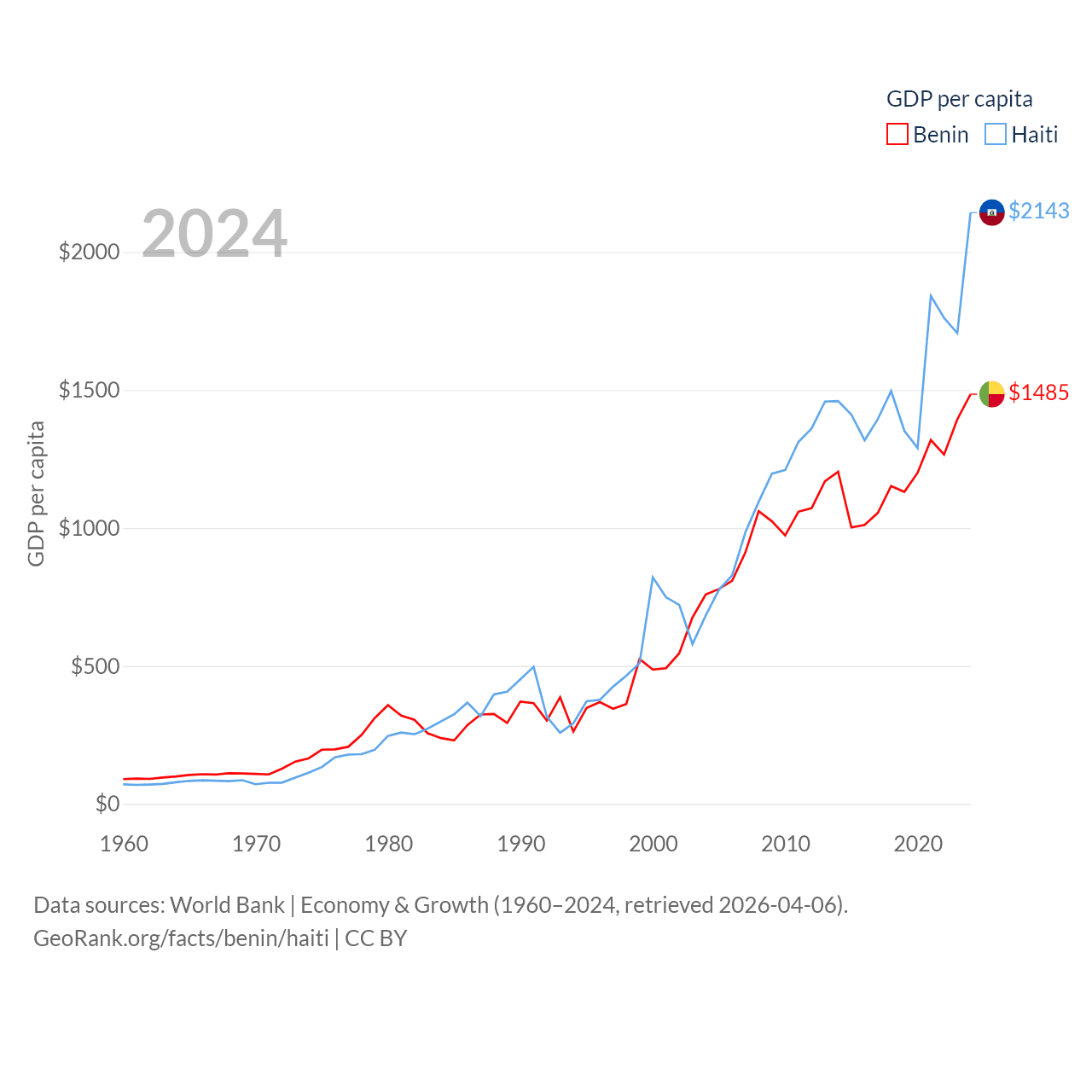 By GDP, Benin ranks 126/197 ($21.5B) and Haiti ranks 117/197 ($25.2B). By GDP per capita, Benin ranks 162/197 ($1,485), while Haiti ranks 153/197 ($2,143).
