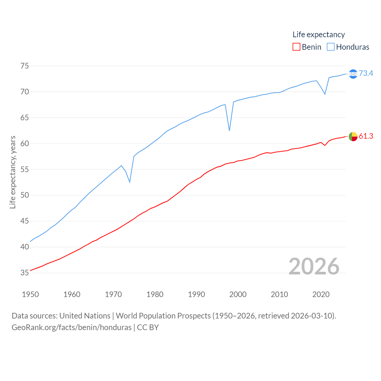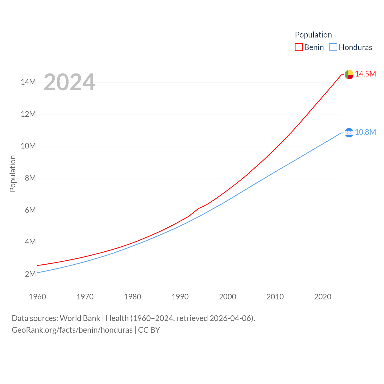 Benin has a population of 14.5M (ranked 76/197), compared with 10.8M in Honduras (ranked 89/197). Benin's land area is 43,537 sq mi versus 43,201 sq mi for Honduras (ranked 99th vs. 100th).