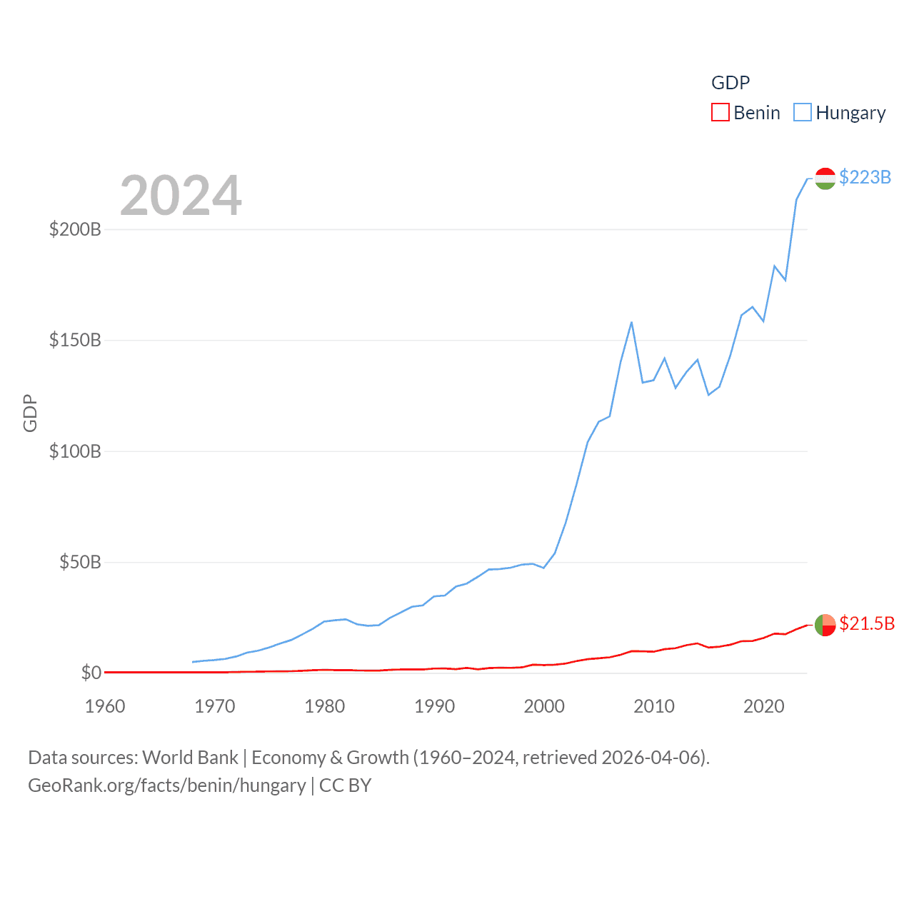By GDP, Benin ranks 126/197 ($21.5B) and Hungary ranks 55/197 ($223B). By GDP per capita, Benin ranks 162/197 ($1,485), while Hungary ranks 55/197 ($23,292).
