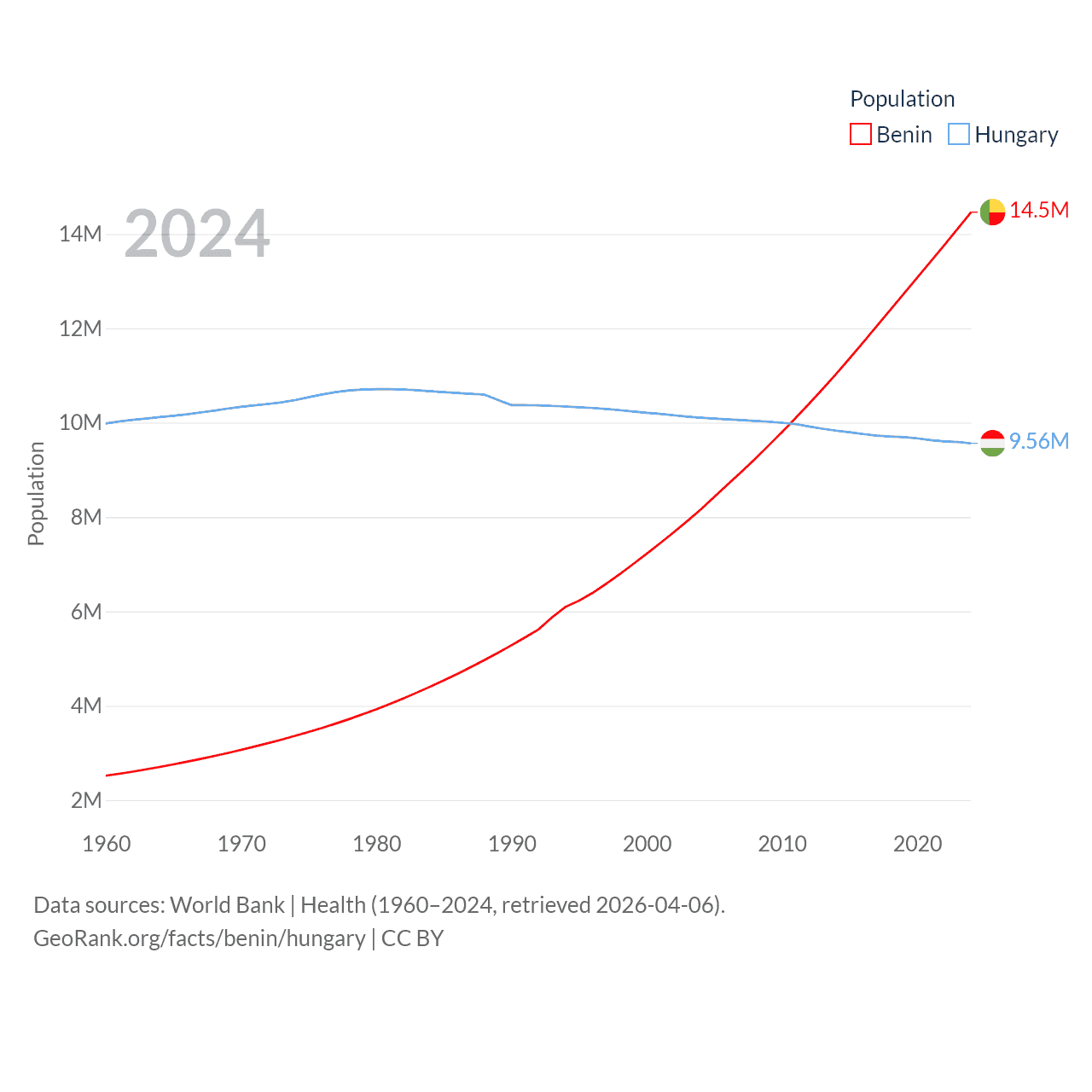 Benin has a population of 14.5M (ranked 76/197), compared with 9.56M in Hungary (ranked 97/197). Benin's land area is 43,537 sq mi versus 35,236 sq mi for Hungary (ranked 99th vs. 109th).