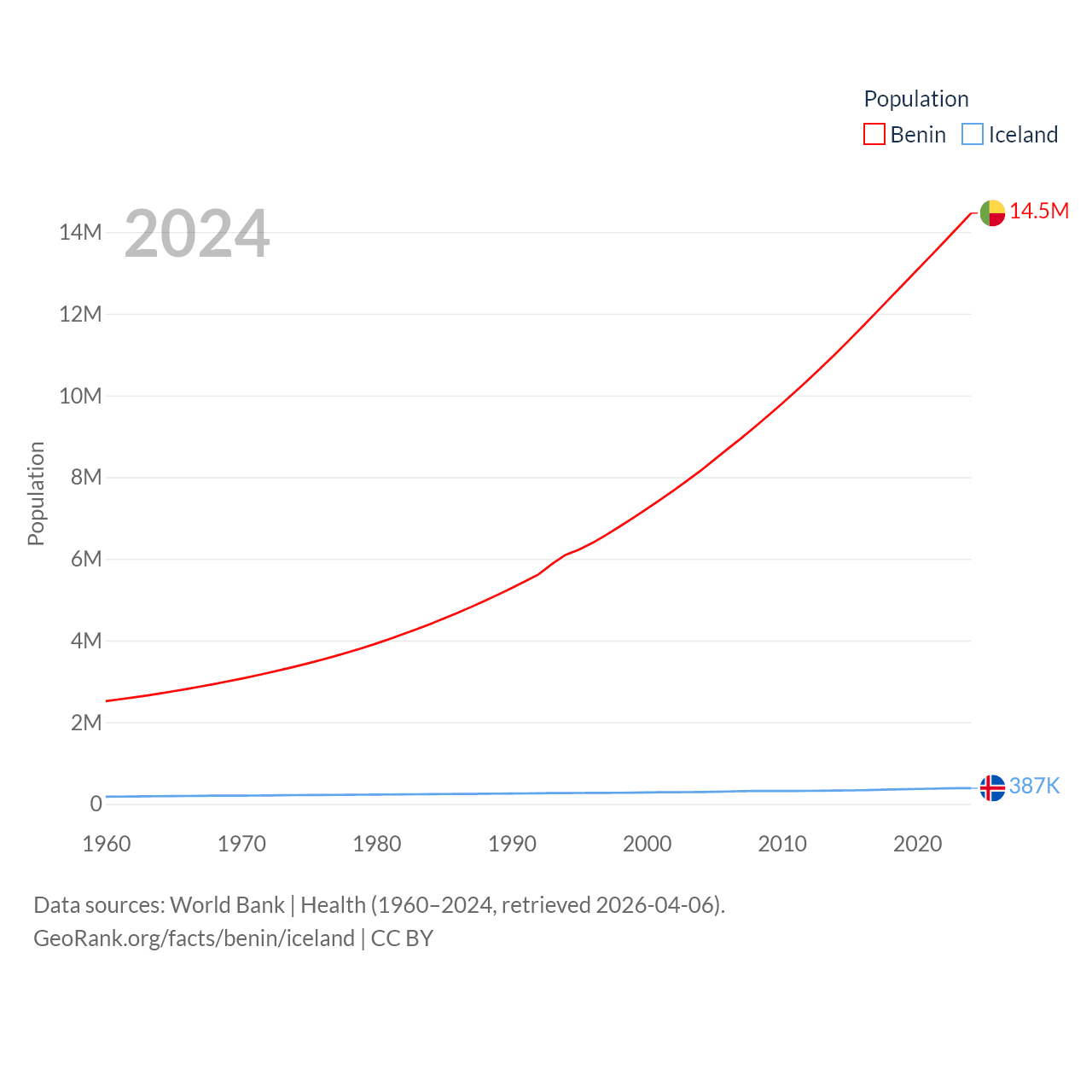 Benin has a population of 14.5M (ranked 76/197), compared with 387K in Iceland (ranked 173/197). Benin's land area is 43,537 sq mi versus 38,931 sq mi for Iceland (ranked 99th vs. 104th).