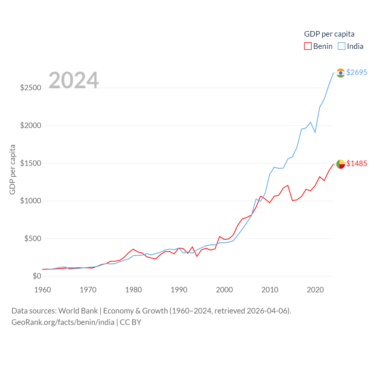 By GDP, Benin ranks 126/197 ($21.5B) and India ranks 5/197 ($3.91T). By GDP per capita, Benin ranks 162/197 ($1,485), while India ranks 143/197 ($2,695).