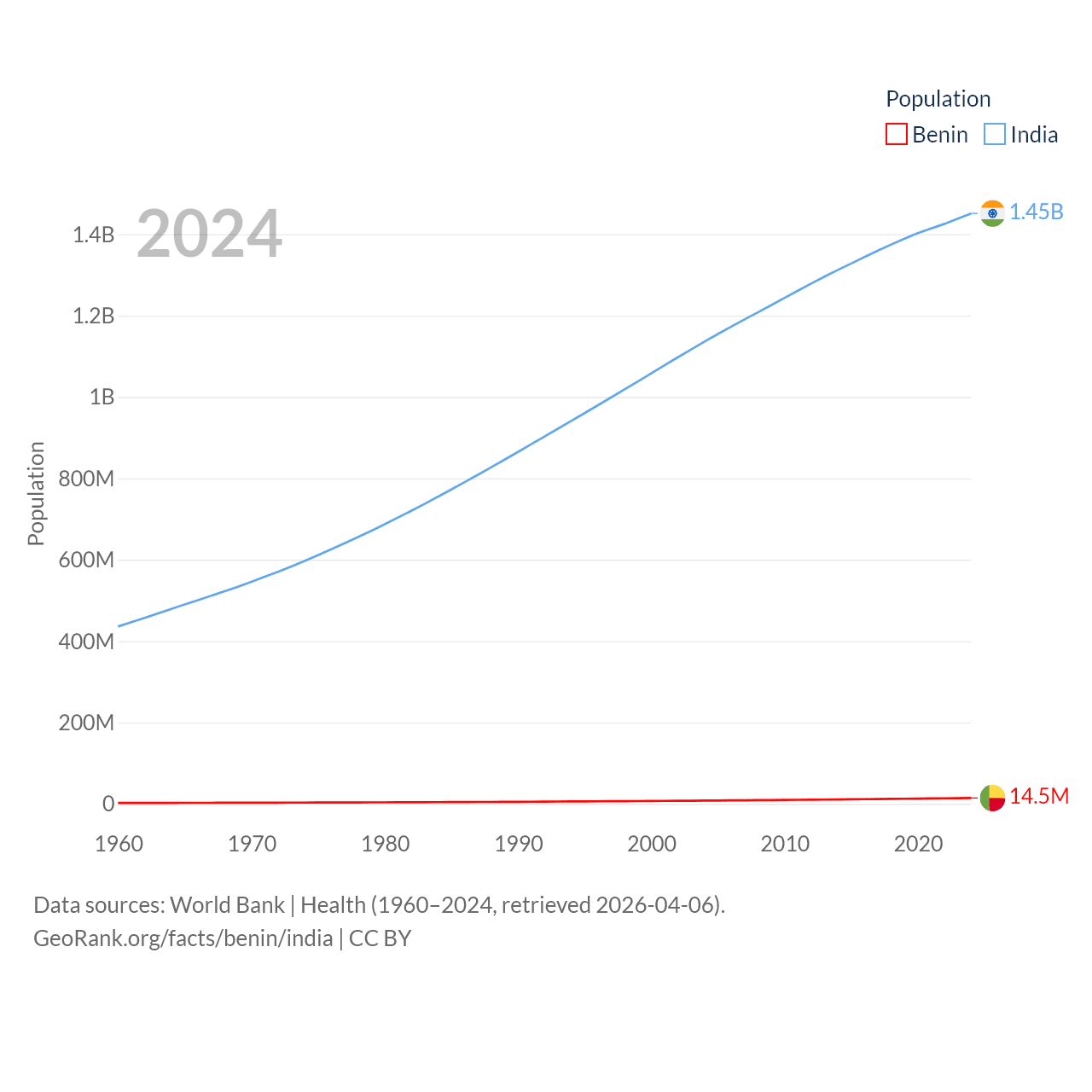 Benin has a population of 14.5M (ranked 76/197), compared with 1.45B in India (ranked 1/197). Benin's land area is 43,537 sq mi versus 1,147,955 sq mi for India (ranked 99th vs. 7th).