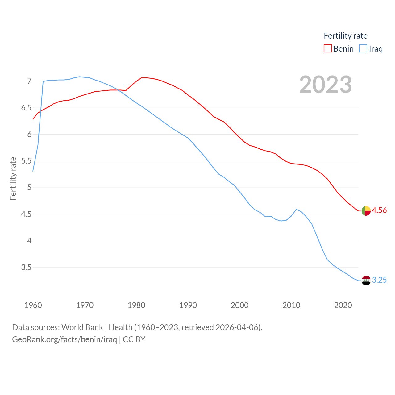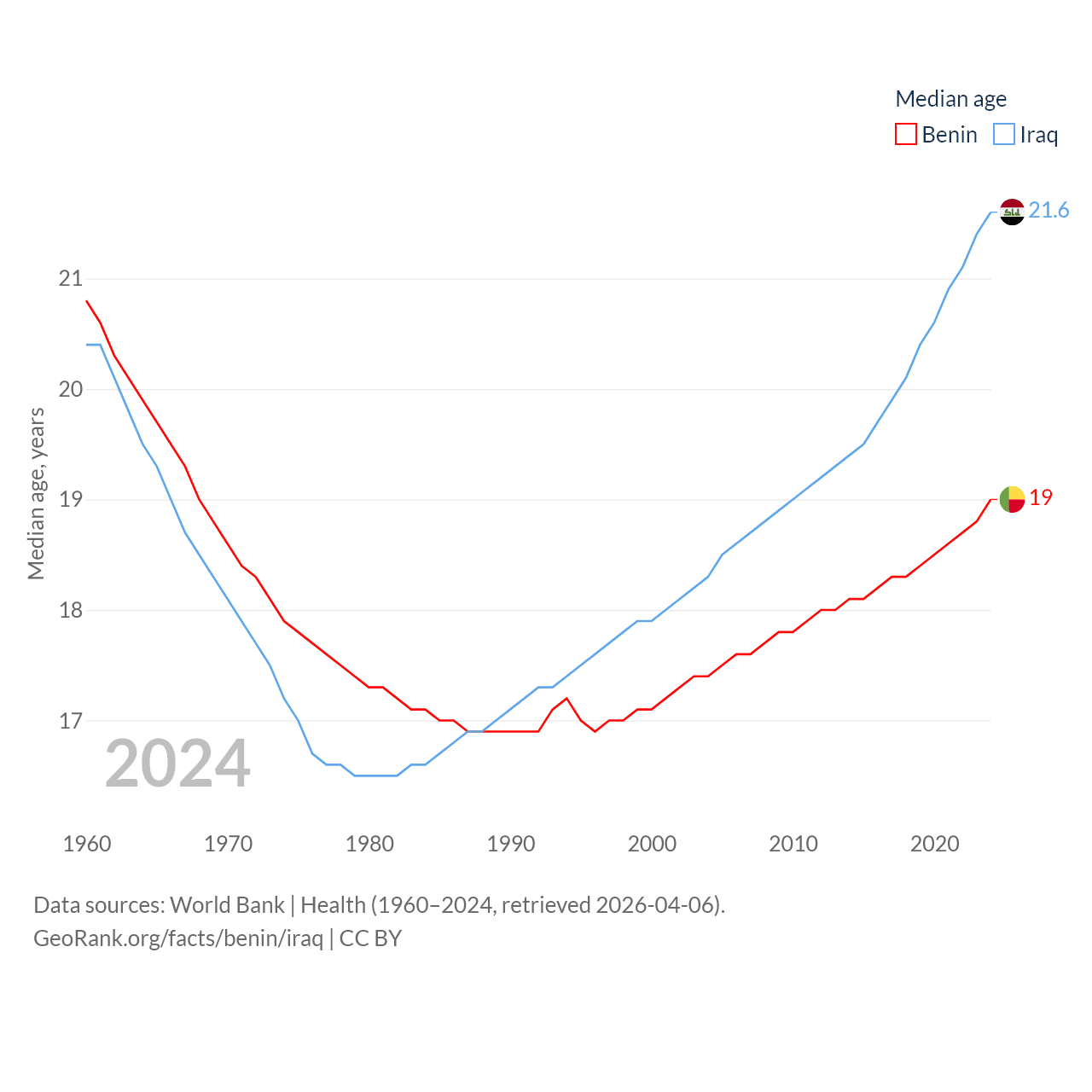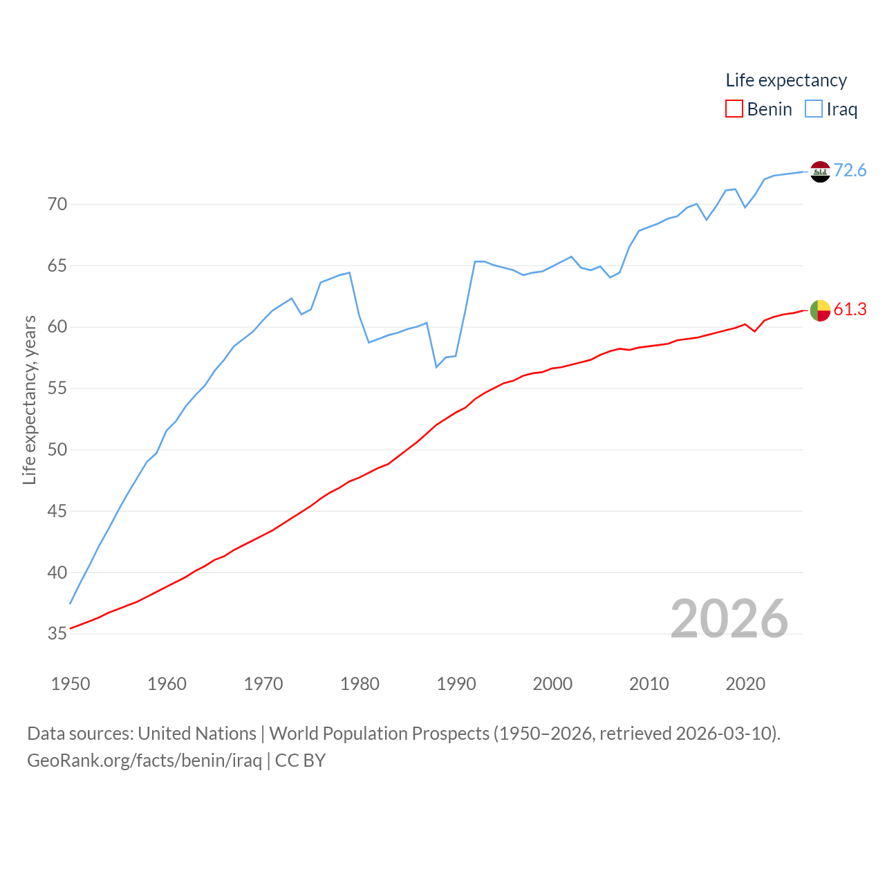Benin has a population of 14.5M (ranked 76/197), compared with 46M in Iraq (ranked 34/197). Benin's land area is 43,537 sq mi versus 167,619 sq mi for Iraq (ranked 99th vs. 57th).