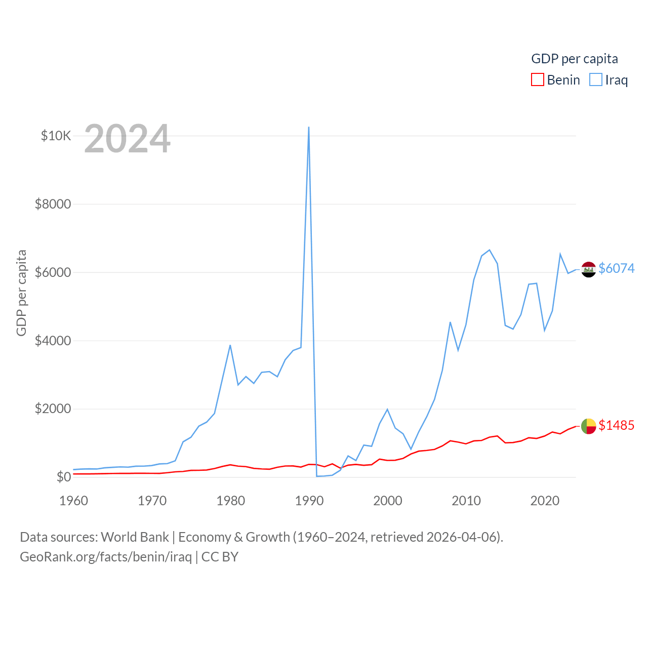By GDP, Benin ranks 126/197 ($21.5B) and Iraq ranks 50/197 ($280B). By GDP per capita, Benin ranks 162/197 ($1,485), while Iraq ranks 113/197 ($6,074).