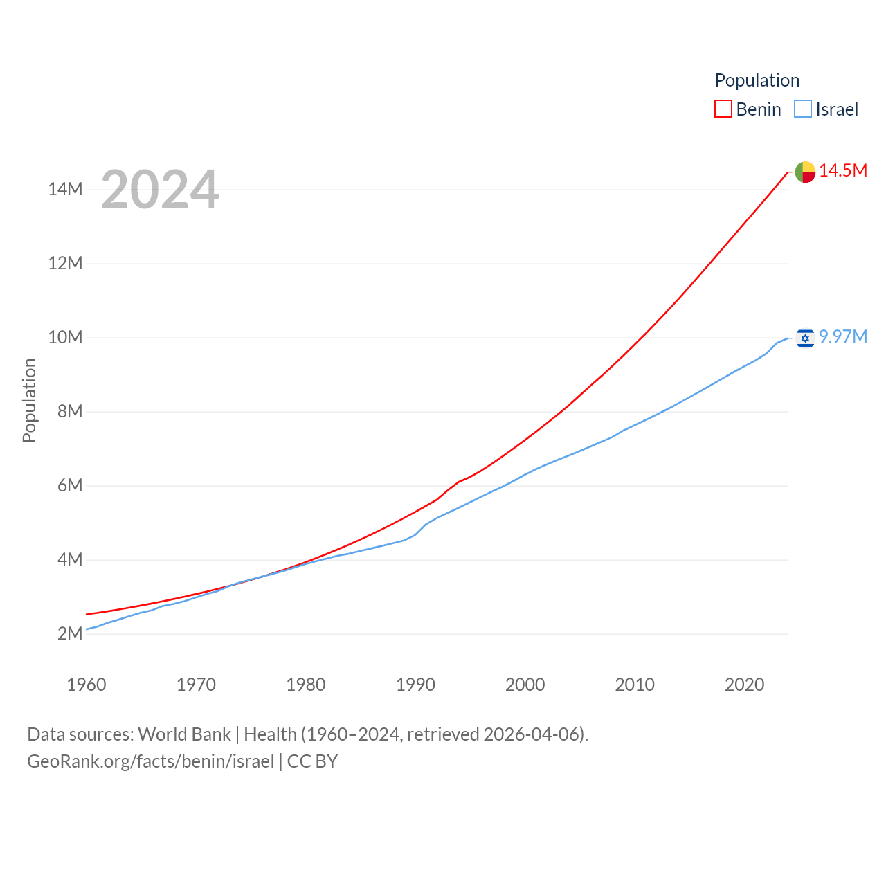 Benin has a population of 14.5M (ranked 76/197), compared with 9.97M in Israel (ranked 96/197). Benin's land area is 43,537 sq mi versus 8,355 sq mi for Israel (ranked 99th vs. 149th).