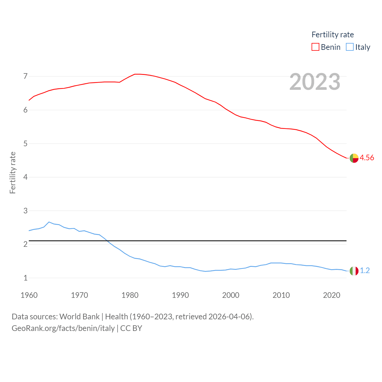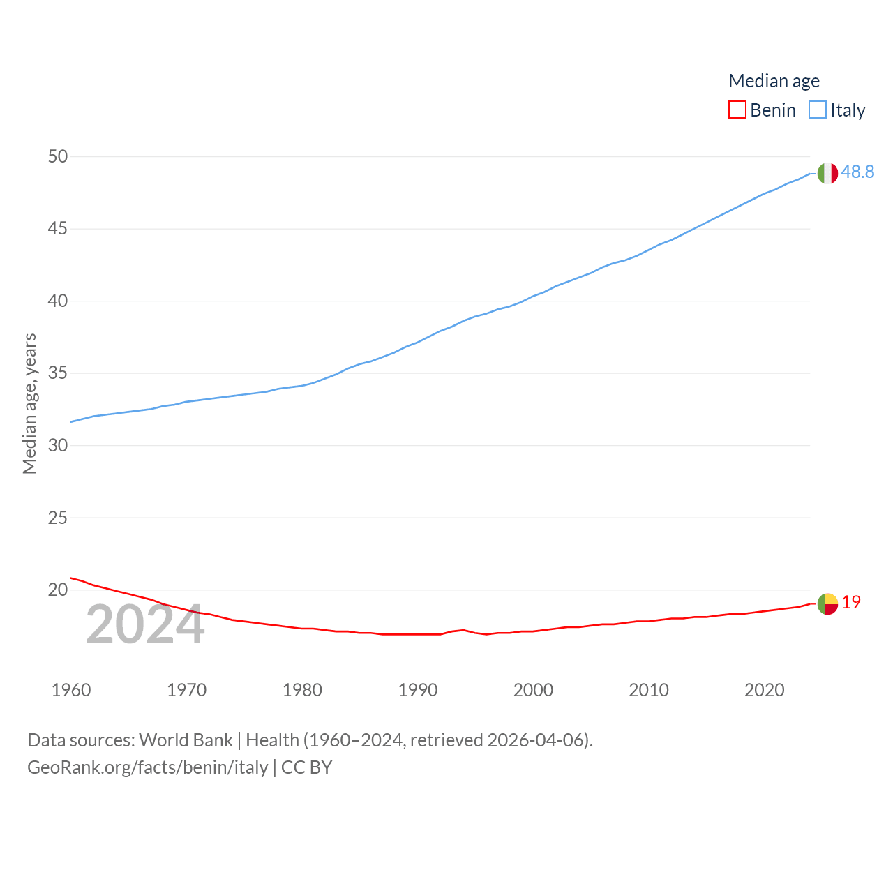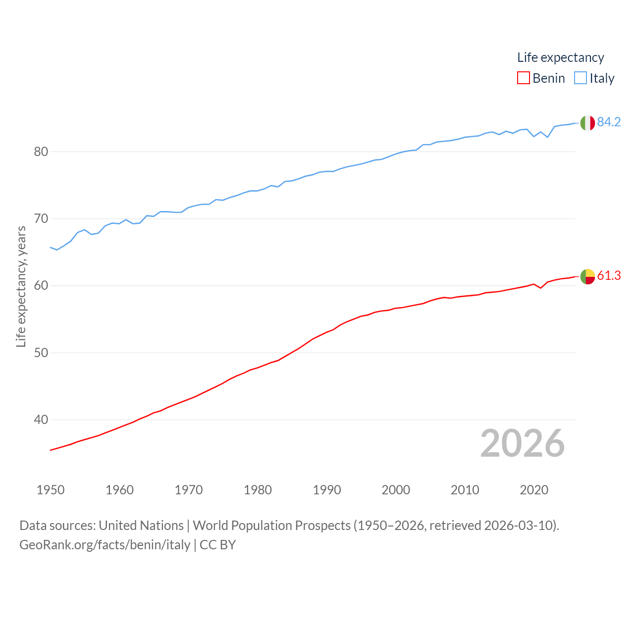 Benin has a population of 14.5M (ranked 76/197), compared with 59M in Italy (ranked 25/197). Benin's land area is 43,537 sq mi versus 114,178 sq mi for Italy (ranked 99th vs. 72nd).