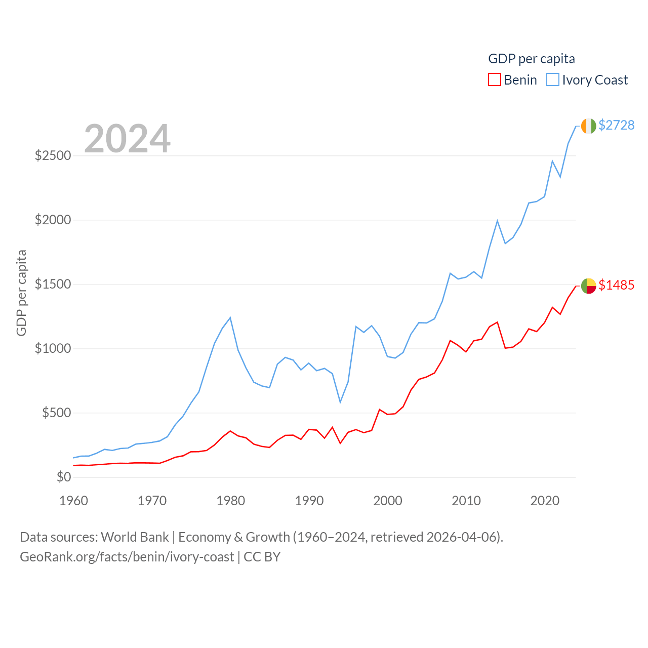 By GDP, Benin ranks 126/197 ($21.5B) and Ivory Coast ranks 77/197 ($87.1B). By GDP per capita, Benin ranks 162/197 ($1,485), while Ivory Coast ranks 142/197 ($2,728).