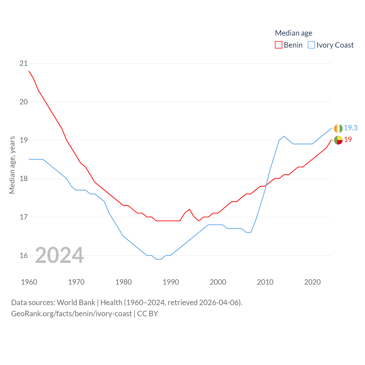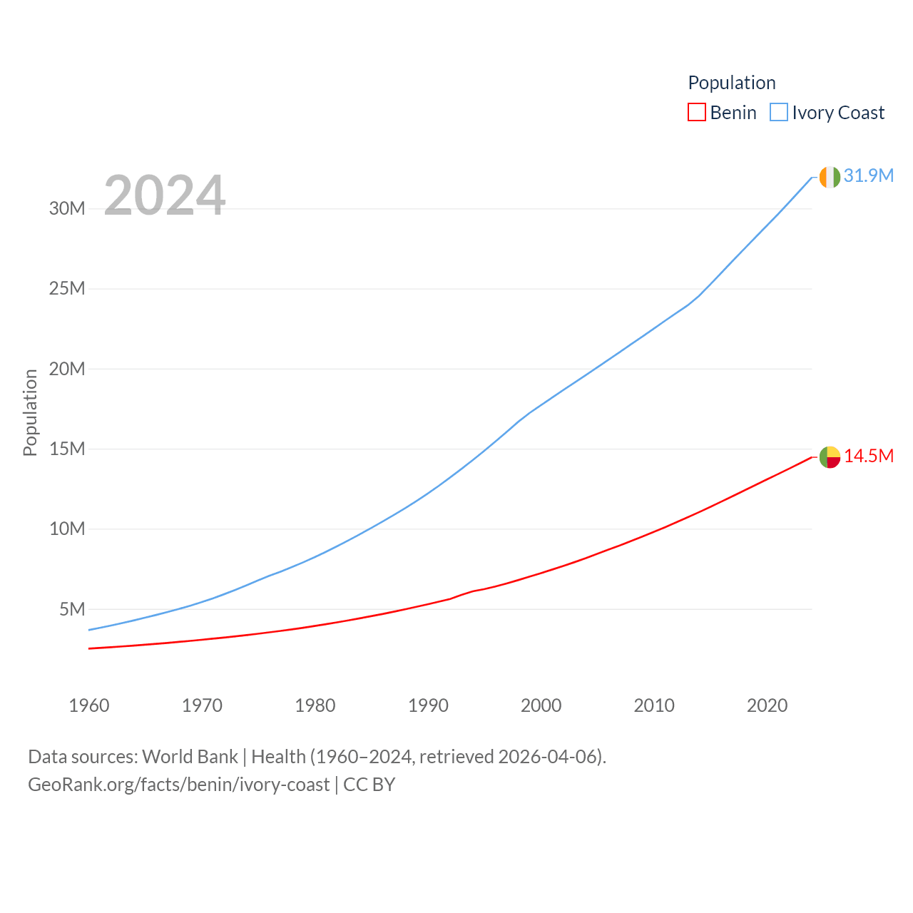 Benin has a population of 14.5M (ranked 76/197), compared with 31.9M in Ivory Coast (ranked 50/197). Benin's land area is 43,537 sq mi versus 122,780 sq mi for Ivory Coast (ranked 99th vs. 66th).