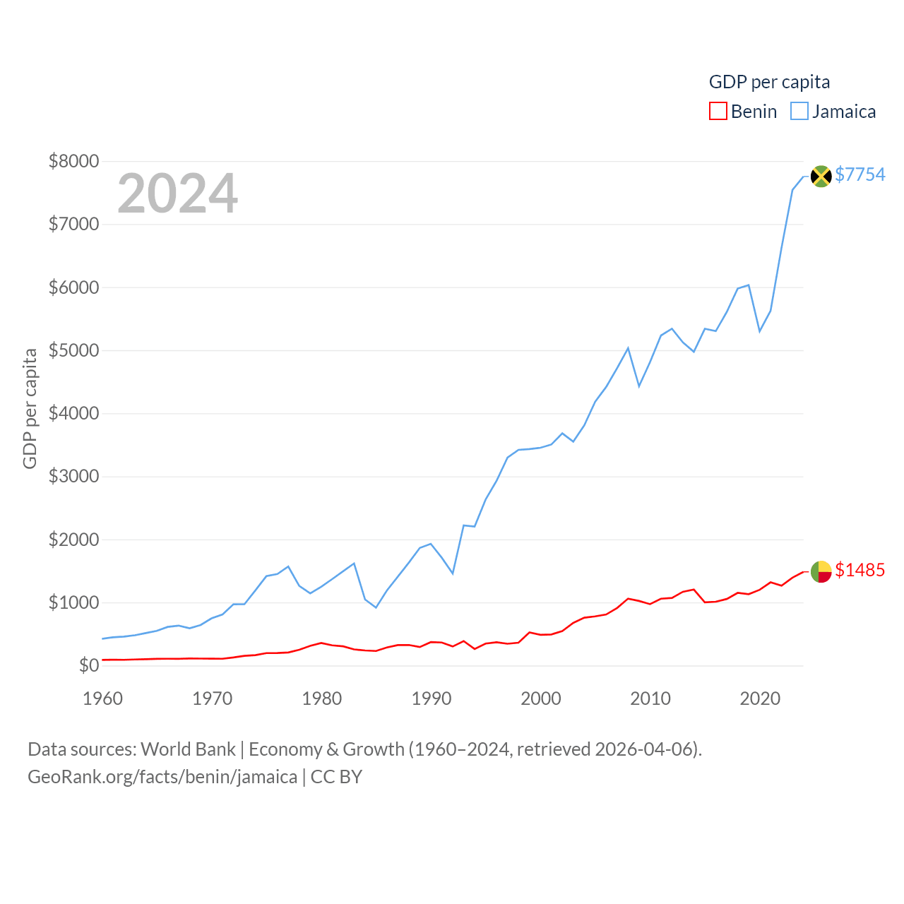 By GDP, Benin ranks 126/197 ($21.5B) and Jamaica ranks 124/197 ($22B). By GDP per capita, Benin ranks 162/197 ($1,485), while Jamaica ranks 95/197 ($7,754).