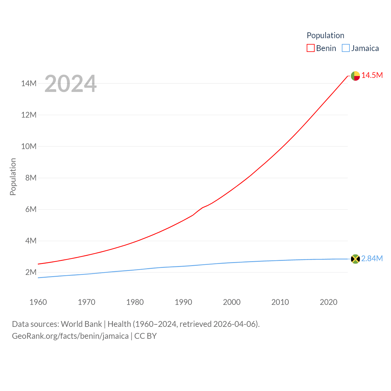 Benin has a population of 14.5M (ranked 76/197), compared with 2.84M in Jamaica (ranked 139/197). Benin's land area is 43,537 sq mi versus 4,181 sq mi for Jamaica (ranked 99th vs. 159th).