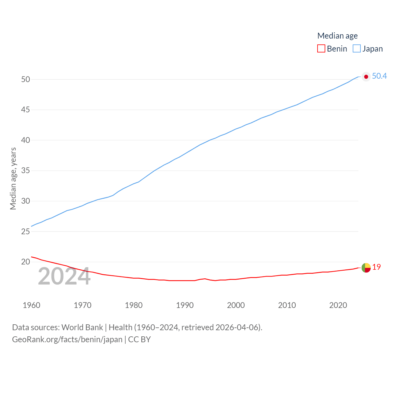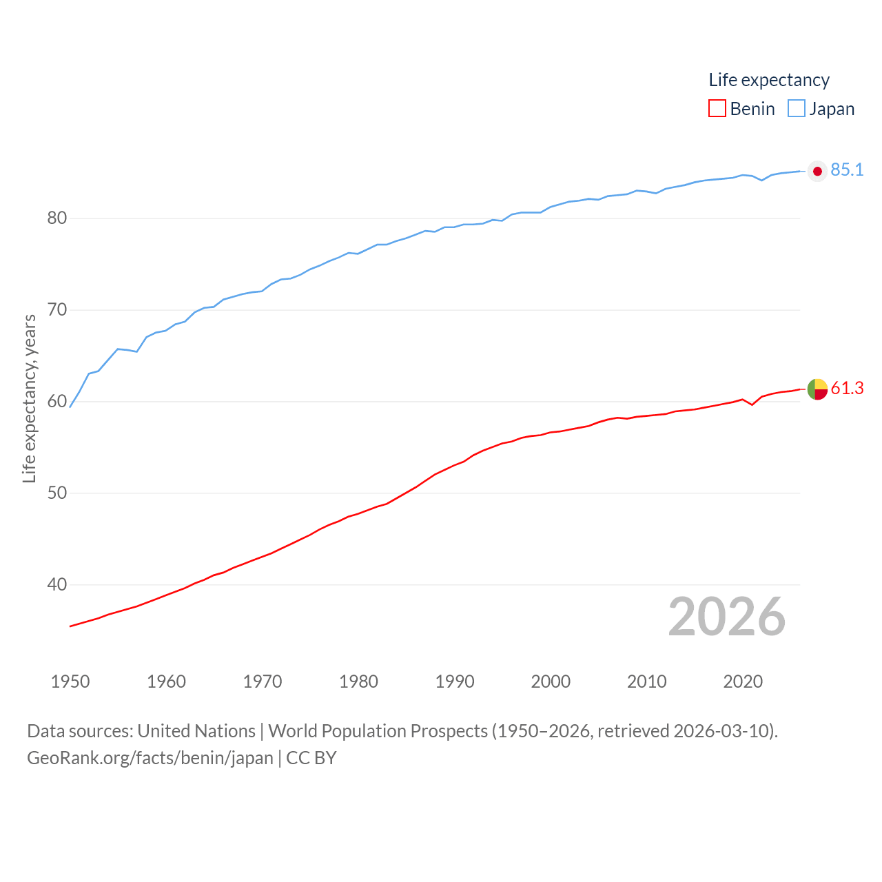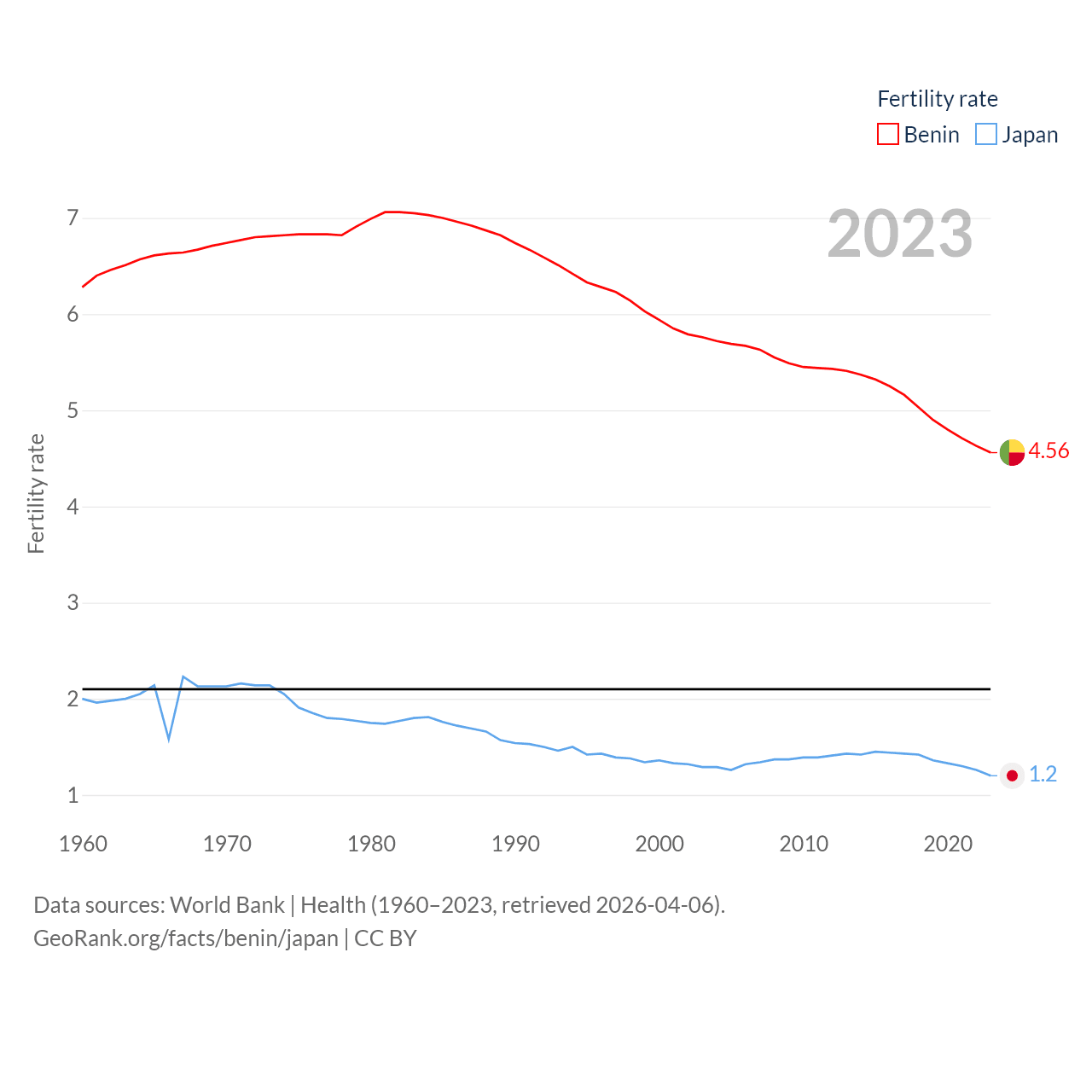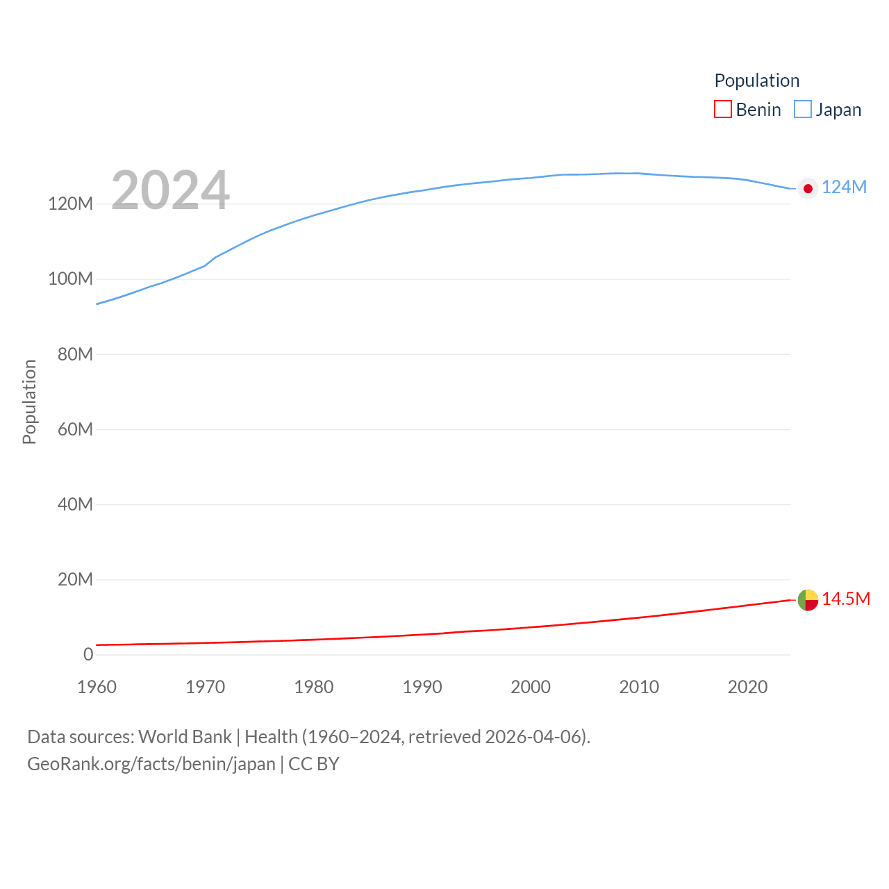 Benin has a population of 14.5M (ranked 76/197), compared with 124M in Japan (ranked 12/197). Benin's land area is 43,537 sq mi versus 140,761 sq mi for Japan (ranked 99th vs. 61st).