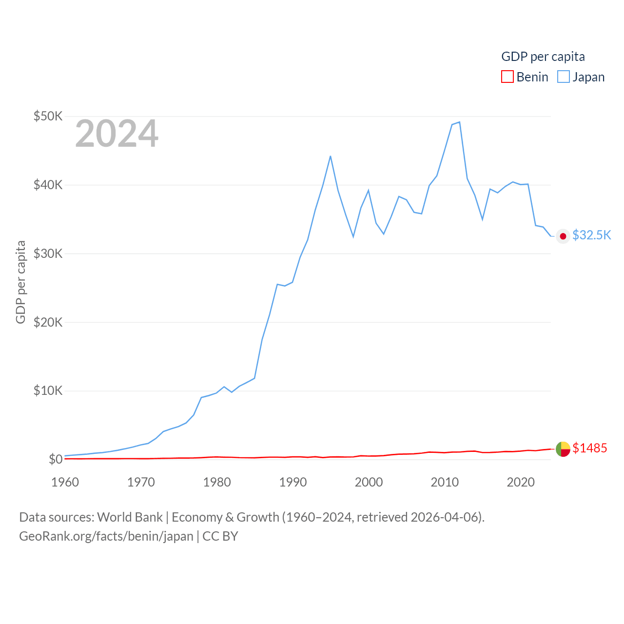 By GDP, Benin ranks 126/197 ($21.5B) and Japan ranks 4/197 ($4.03T). By GDP per capita, Benin ranks 162/197 ($1,485), while Japan ranks 38/197 ($32,487).