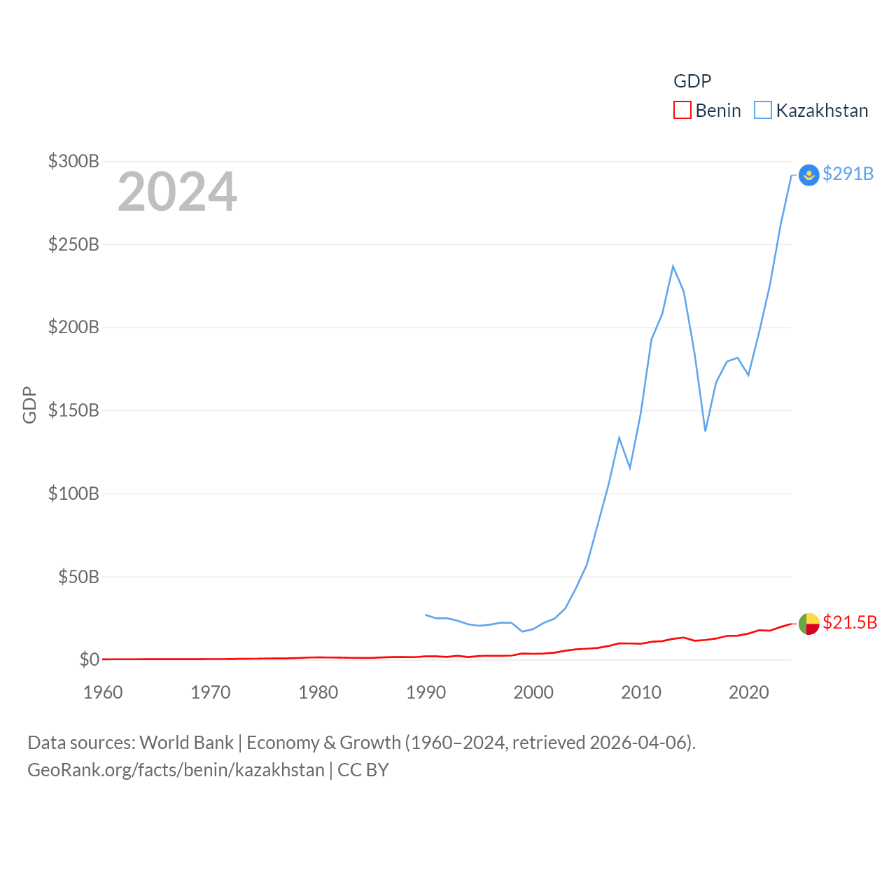 By GDP, Benin ranks 126/197 ($21.5B) and Kazakhstan ranks 48/197 ($291B). By GDP per capita, Benin ranks 162/197 ($1,485), while Kazakhstan ranks 71/197 ($14,155).