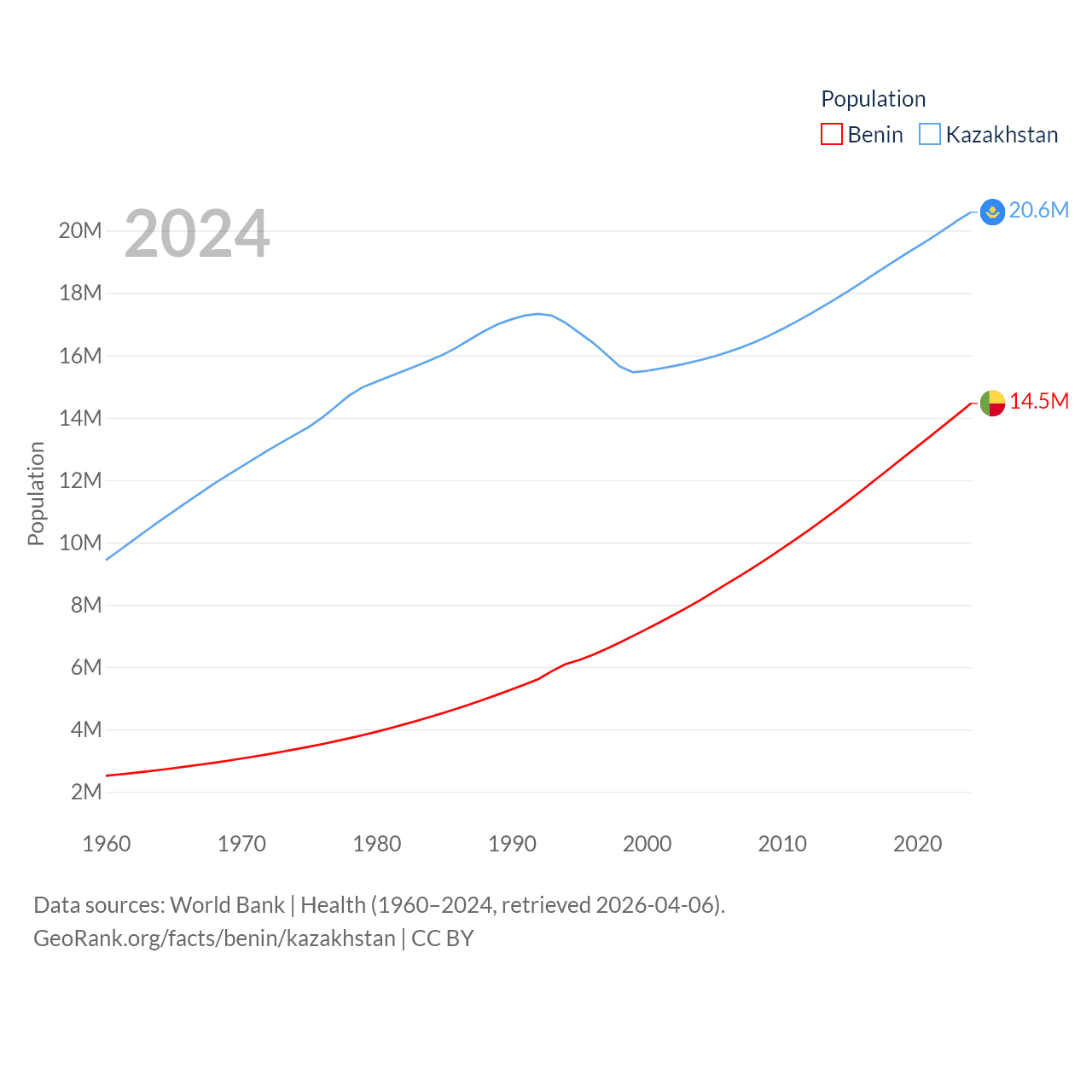 Benin has a population of 14.5M (ranked 76/197), compared with 20.6M in Kazakhstan (ranked 64/197). Benin's land area is 43,537 sq mi versus 1,042,360 sq mi for Kazakhstan (ranked 99th vs. 9th).