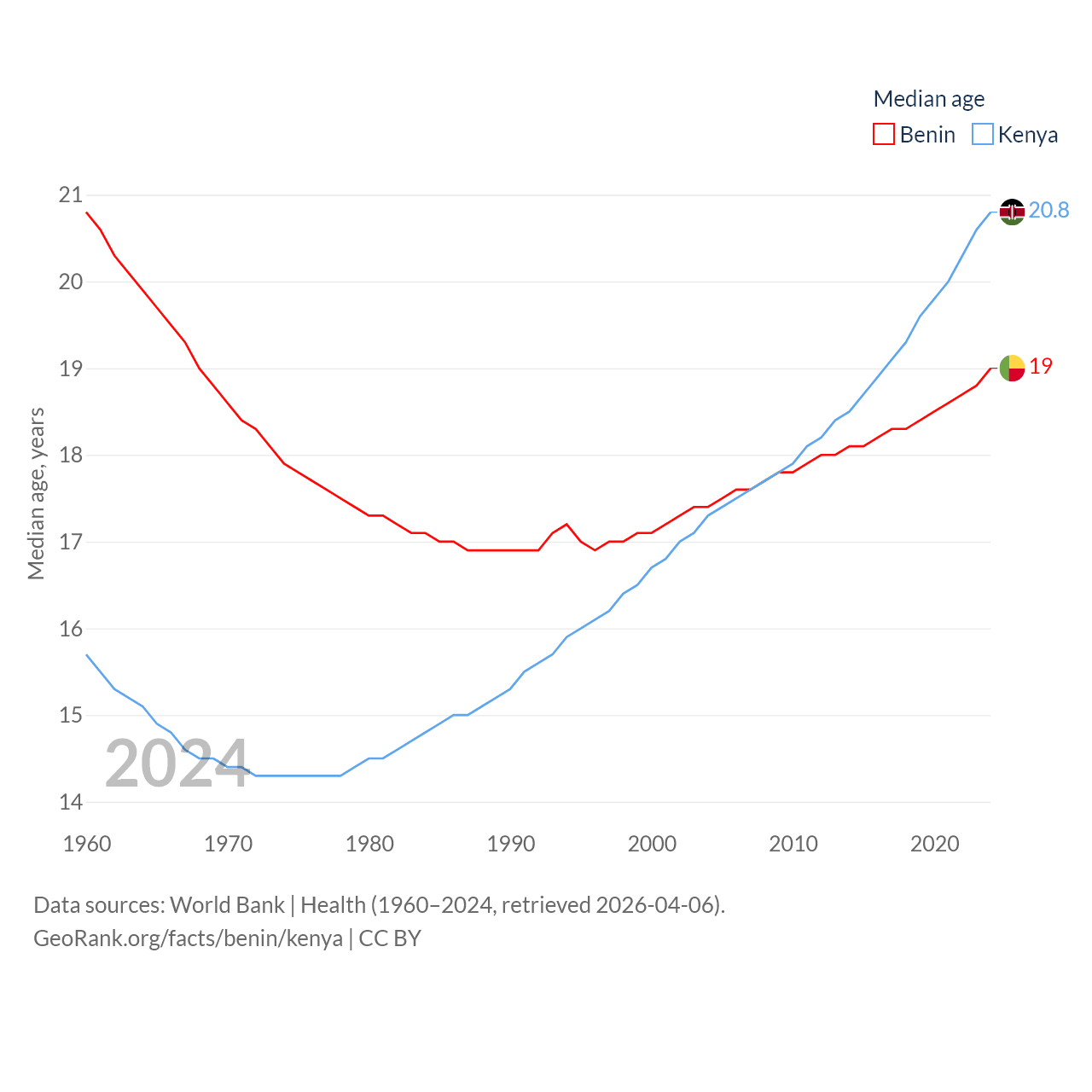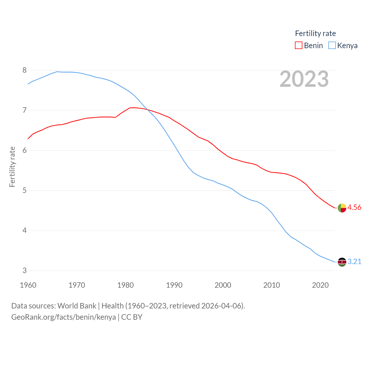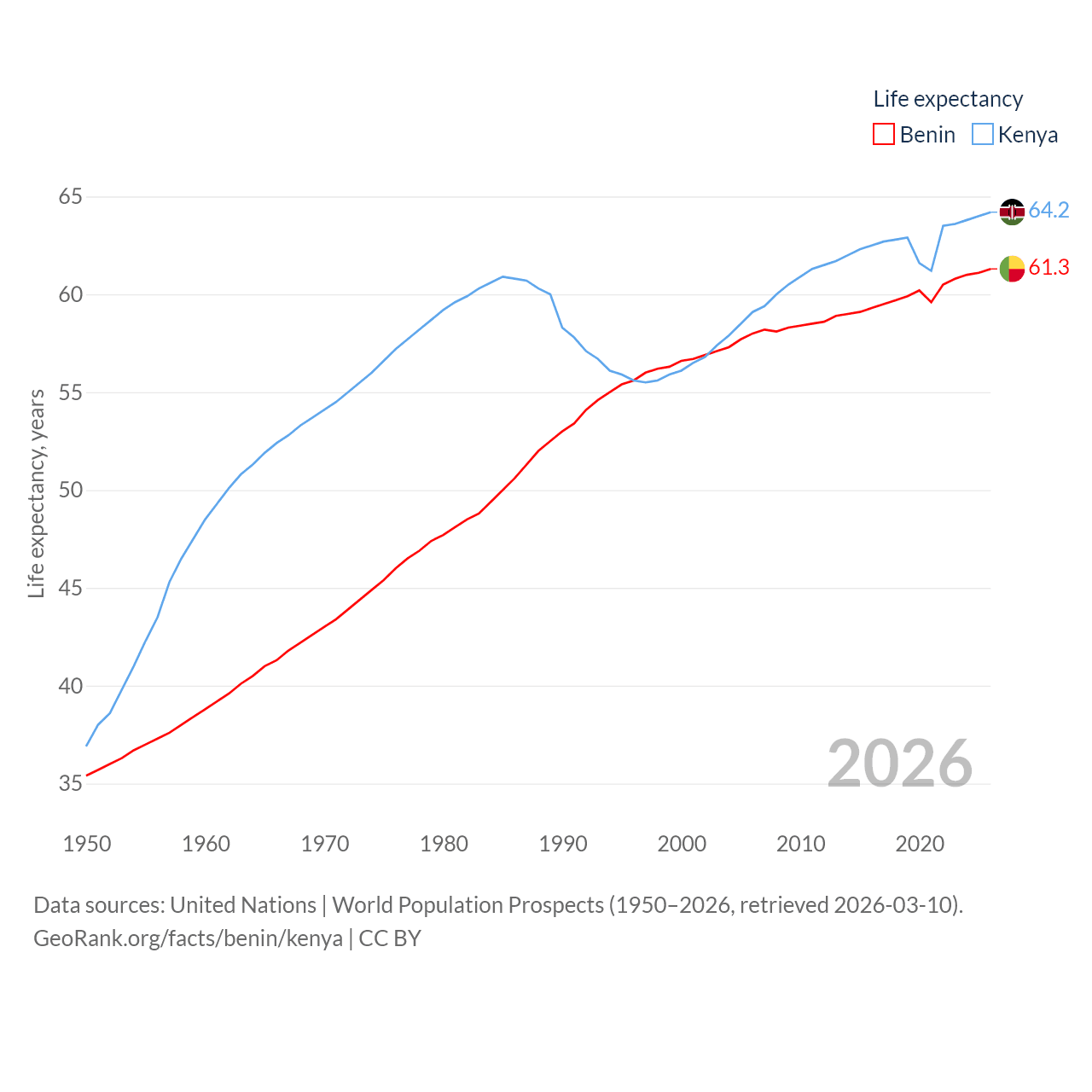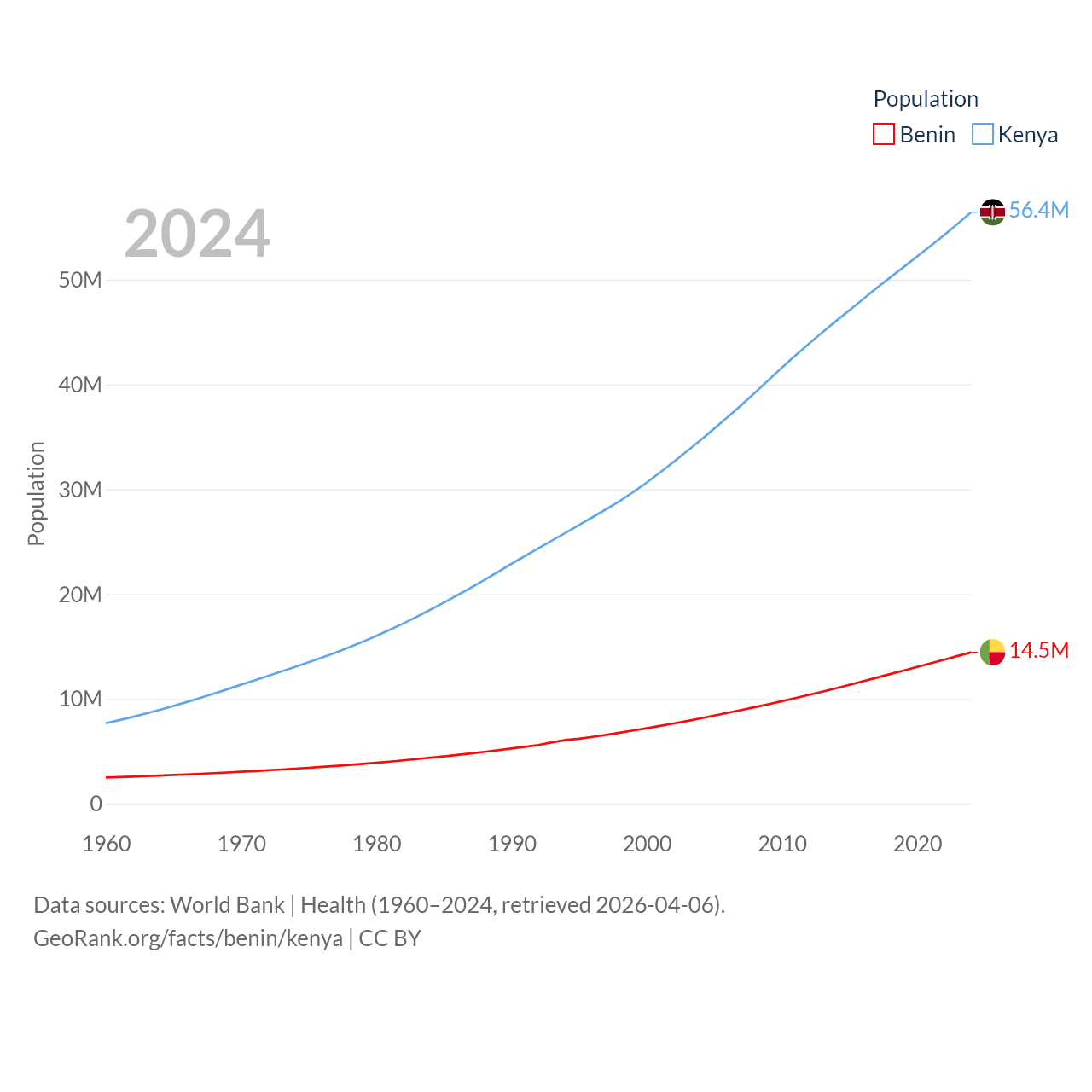Benin has a population of 14.5M (ranked 76/197), compared with 56.4M in Kenya (ranked 26/197). Benin's land area is 43,537 sq mi versus 224,278 sq mi for Kenya (ranked 99th vs. 45th).