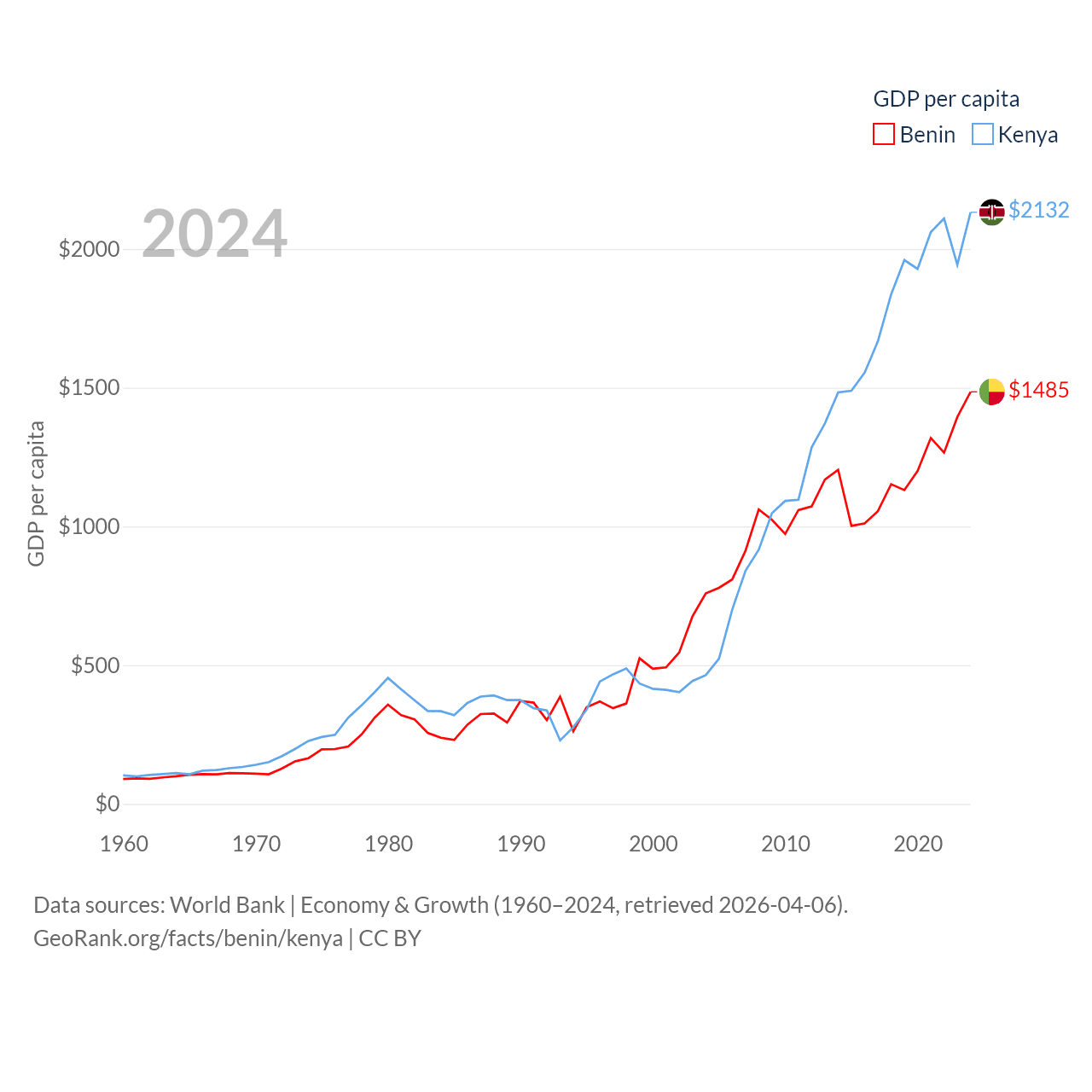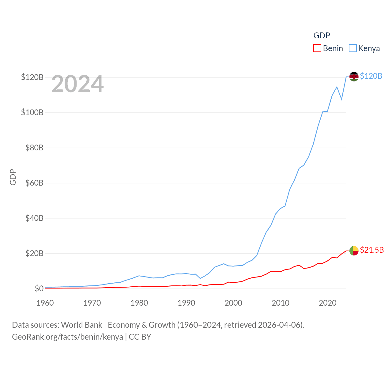 By GDP, Benin ranks 126/197 ($21.5B) and Kenya ranks 64/197 ($120B). By GDP per capita, Benin ranks 162/197 ($1,485), while Kenya ranks 154/197 ($2,132).