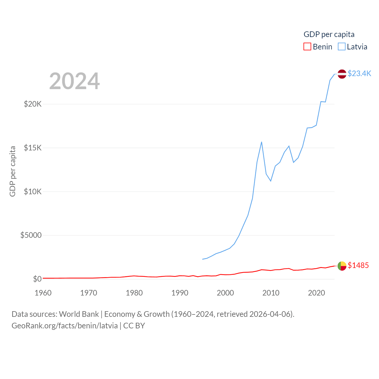 By GDP, Benin ranks 126/197 ($21.5B) and Latvia ranks 99/197 ($43.7B). By GDP per capita, Benin ranks 162/197 ($1,485), while Latvia ranks 54/197 ($23,409).
