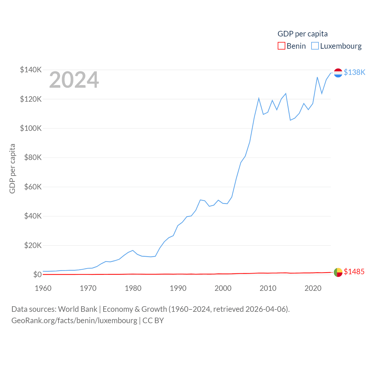 By GDP, Benin ranks 126/197 ($21.5B) and Luxembourg ranks 74/197 ($93.3B). By GDP per capita, Benin ranks 162/197 ($1,485), while Luxembourg ranks 3/197 ($137,782).