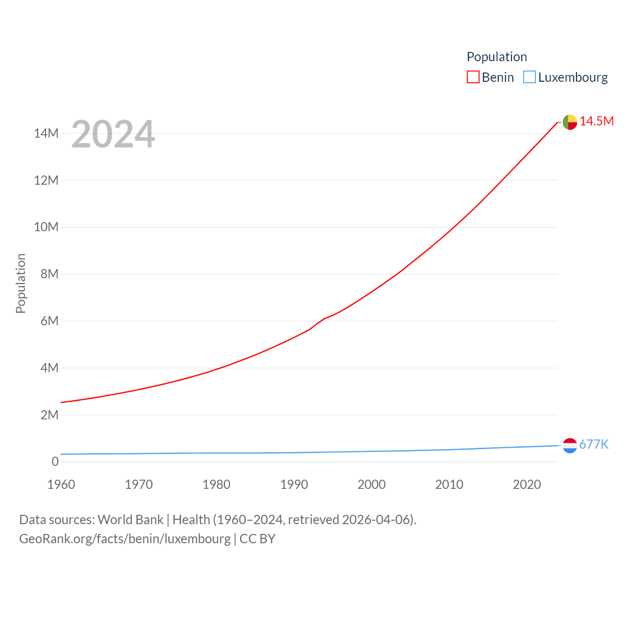 Benin has a population of 14.5M (ranked 76/197), compared with 677K in Luxembourg (ranked 164/197). Benin's land area is 43,537 sq mi versus 994 sq mi for Luxembourg (ranked 99th vs. 169th).
