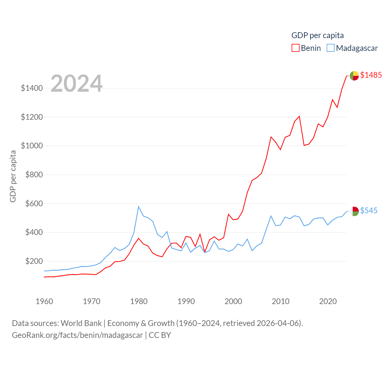 By GDP, Benin ranks 126/197 ($21.5B) and Madagascar ranks 136/197 ($17.4B). By GDP per capita, Benin ranks 162/197 ($1,485), while Madagascar ranks 193/197 ($545).