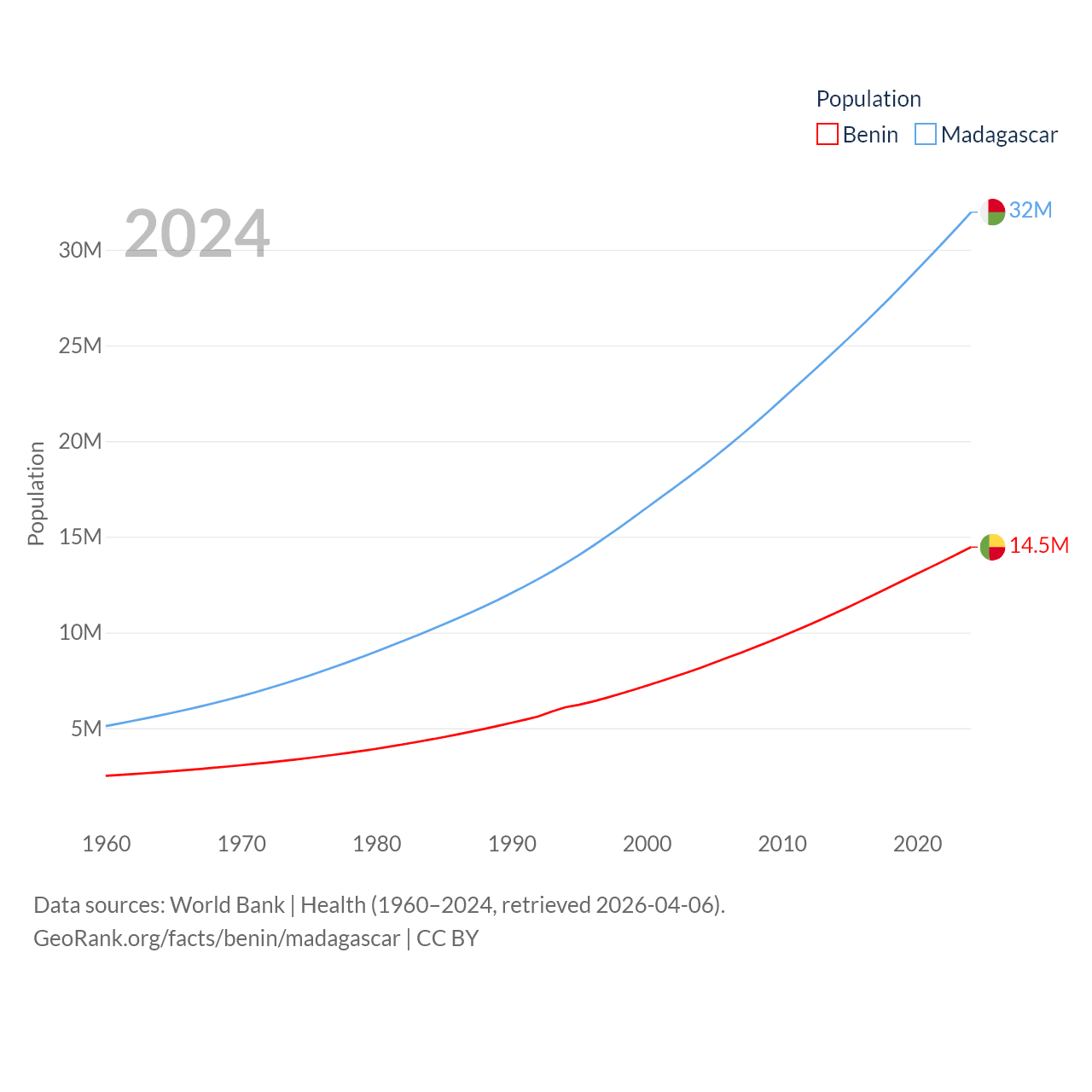 Benin has a population of 14.5M (ranked 76/197), compared with 32M in Madagascar (ranked 49/197). Benin's land area is 43,537 sq mi versus 224,634 sq mi for Madagascar (ranked 99th vs. 44th).