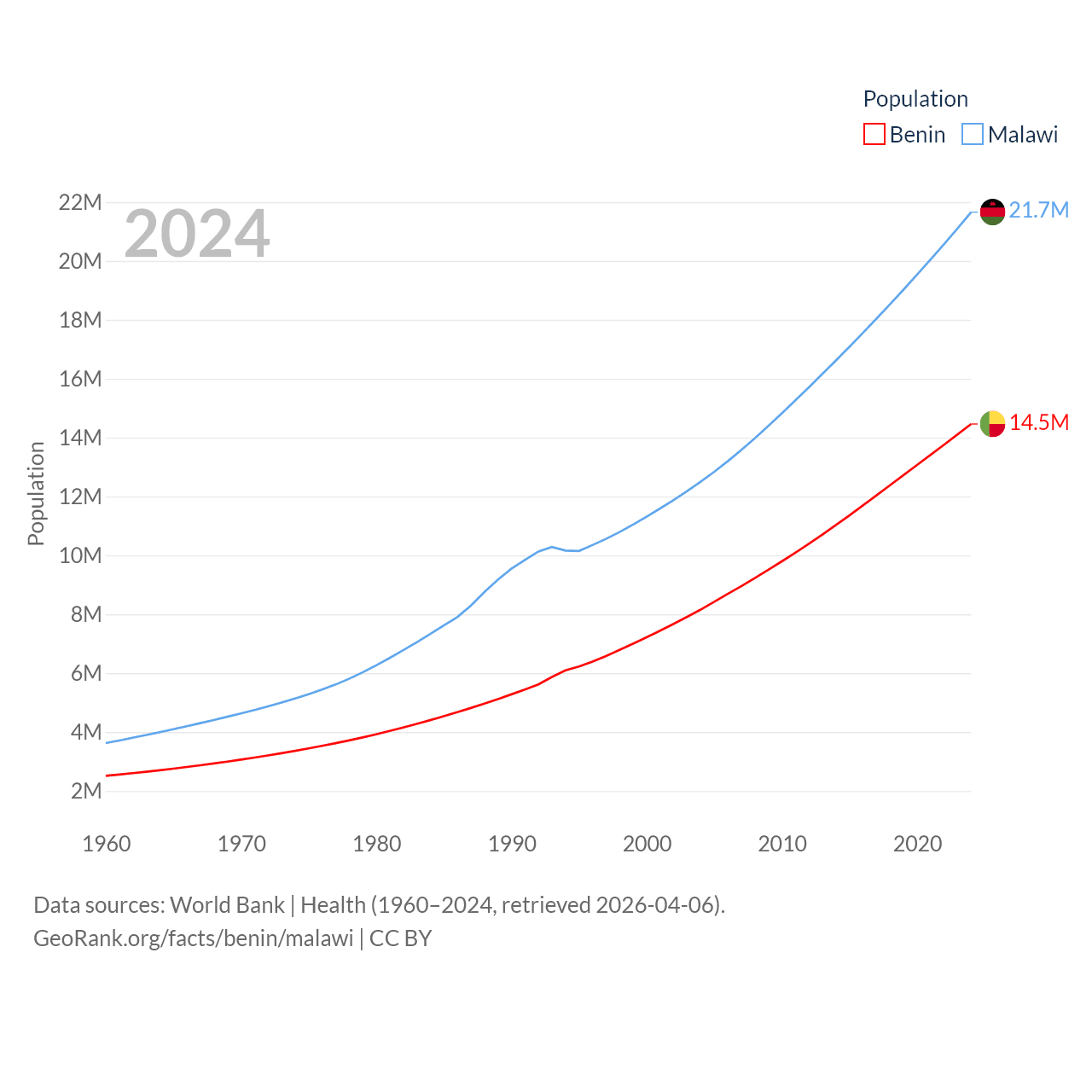 Benin has a population of 14.5M (ranked 76/197), compared with 21.7M in Malawi (ranked 62/197). Benin's land area is 43,537 sq mi versus 36,402 sq mi for Malawi (ranked 99th vs. 107th).