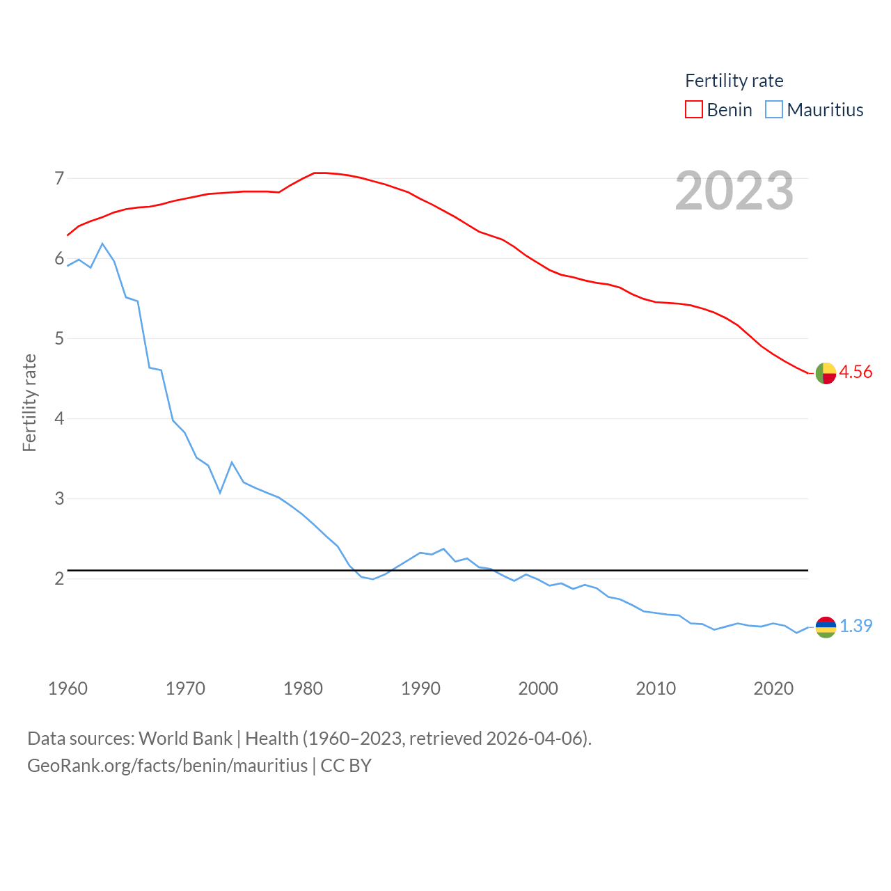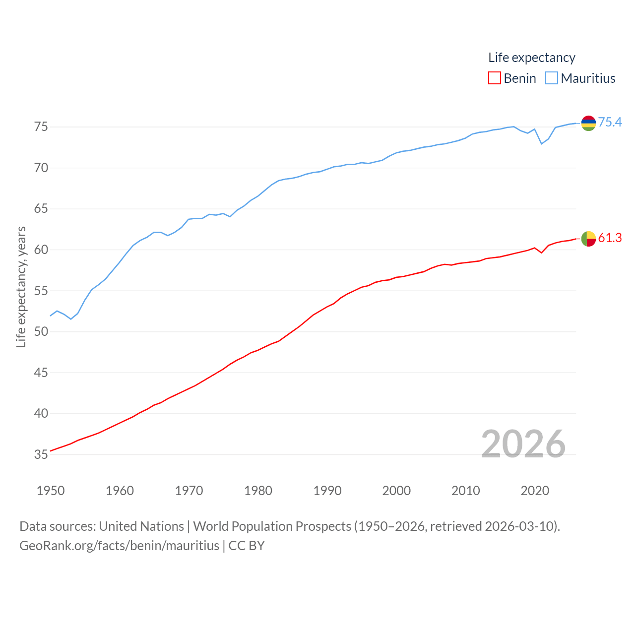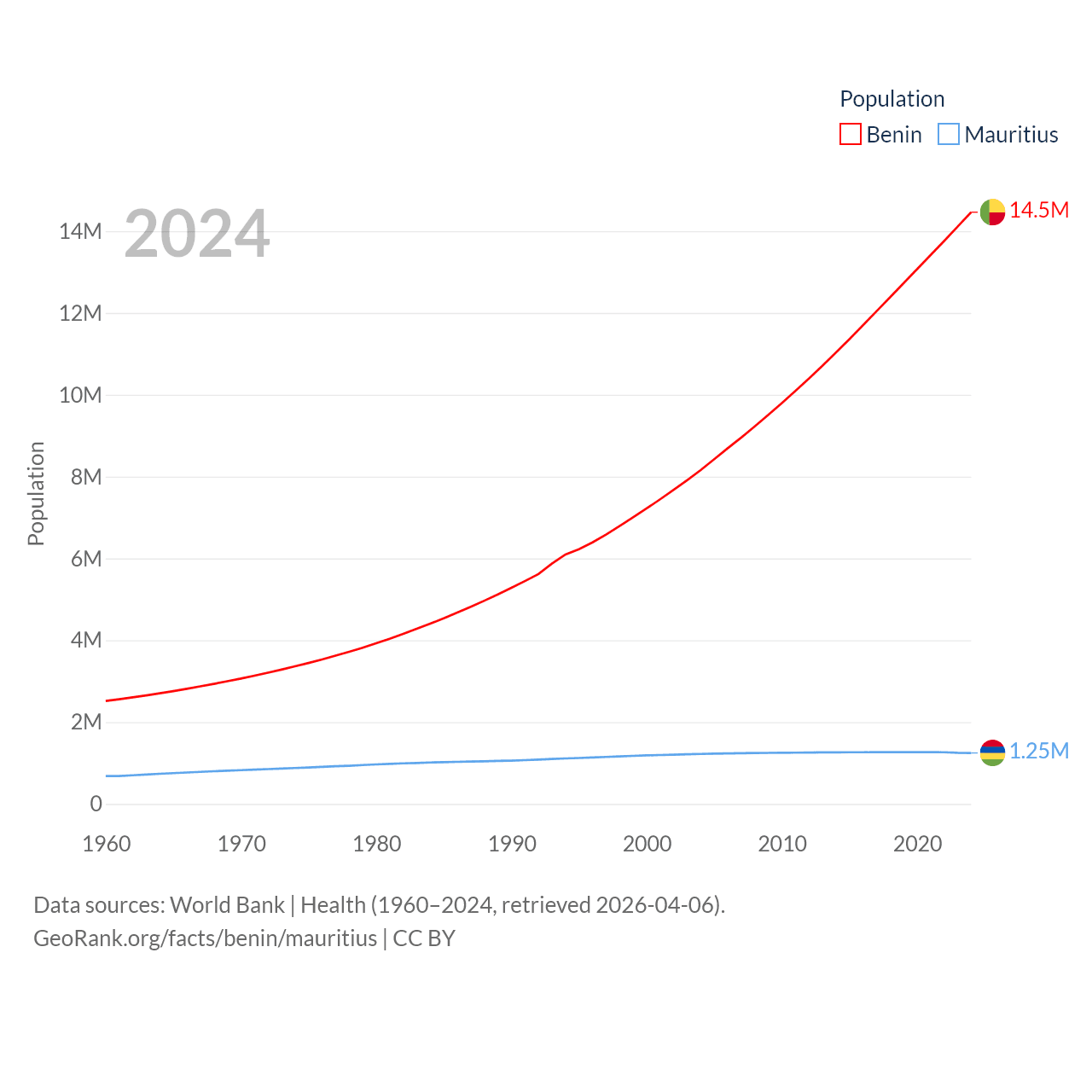 Benin has a population of 14.5M (ranked 76/197), compared with 1.25M in Mauritius (ranked 156/197). Benin's land area is 43,537 sq mi versus 771 sq mi for Mauritius (ranked 99th vs. 170th).