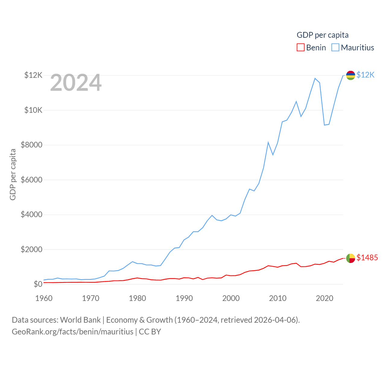 By GDP, Benin ranks 126/197 ($21.5B) and Mauritius ranks 143/197 ($14.9B). By GDP per capita, Benin ranks 162/197 ($1,485), while Mauritius ranks 78/197 ($11,991).