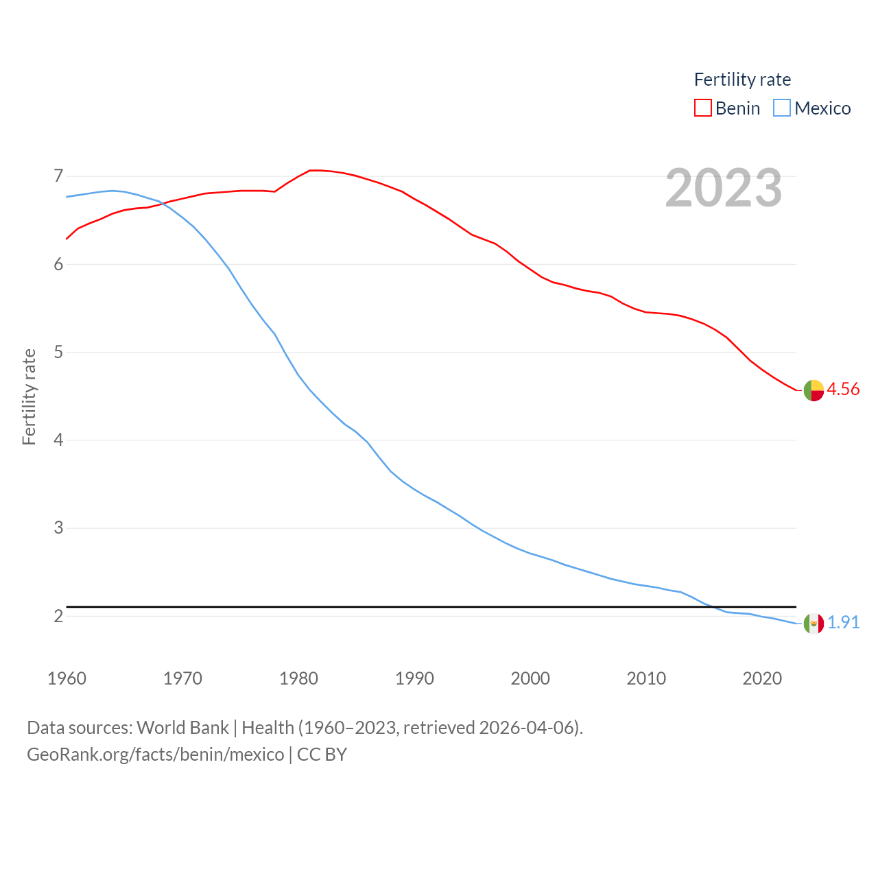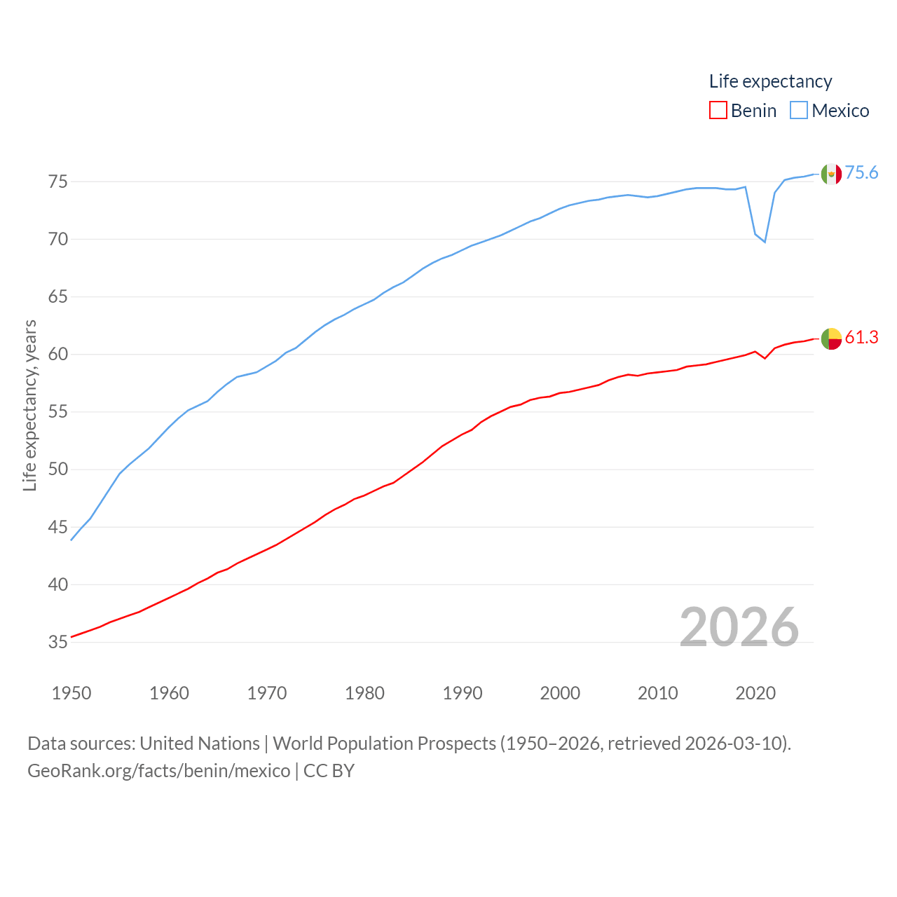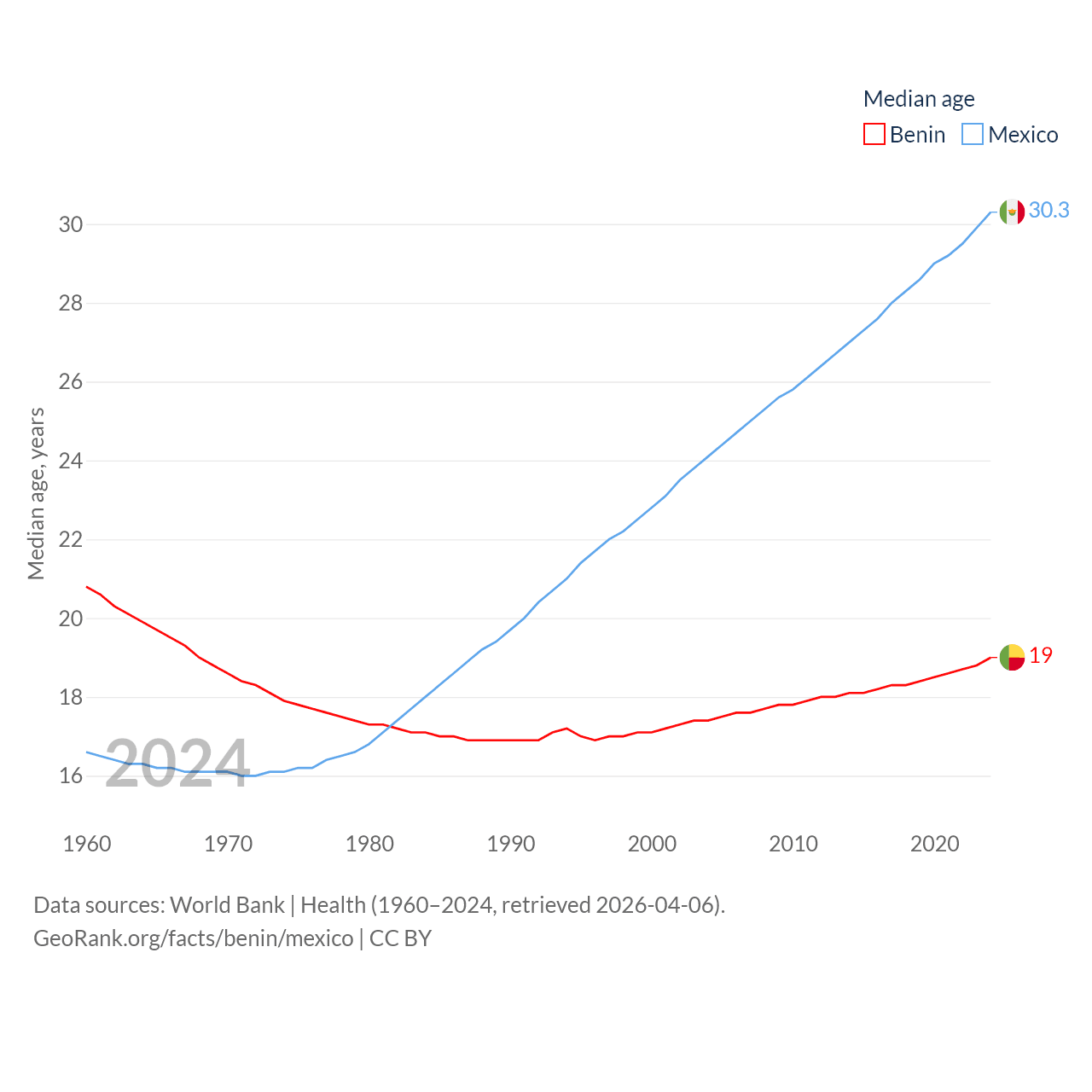 Benin has a population of 14.5M (ranked 76/197), compared with 131M in Mexico (ranked 11/197). Benin's land area is 43,537 sq mi versus 750,563 sq mi for Mexico (ranked 99th vs. 13th).