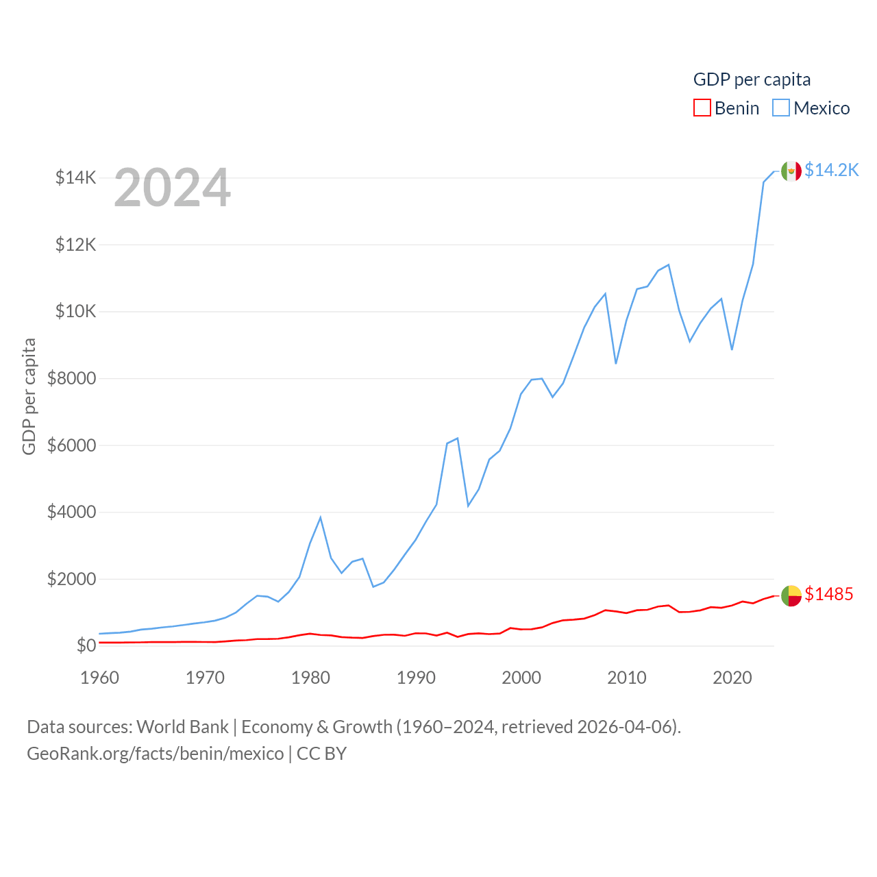 By GDP, Benin ranks 126/197 ($21.5B) and Mexico ranks 13/197 ($1.86T). By GDP per capita, Benin ranks 162/197 ($1,485), while Mexico ranks 69/197 ($14,186).