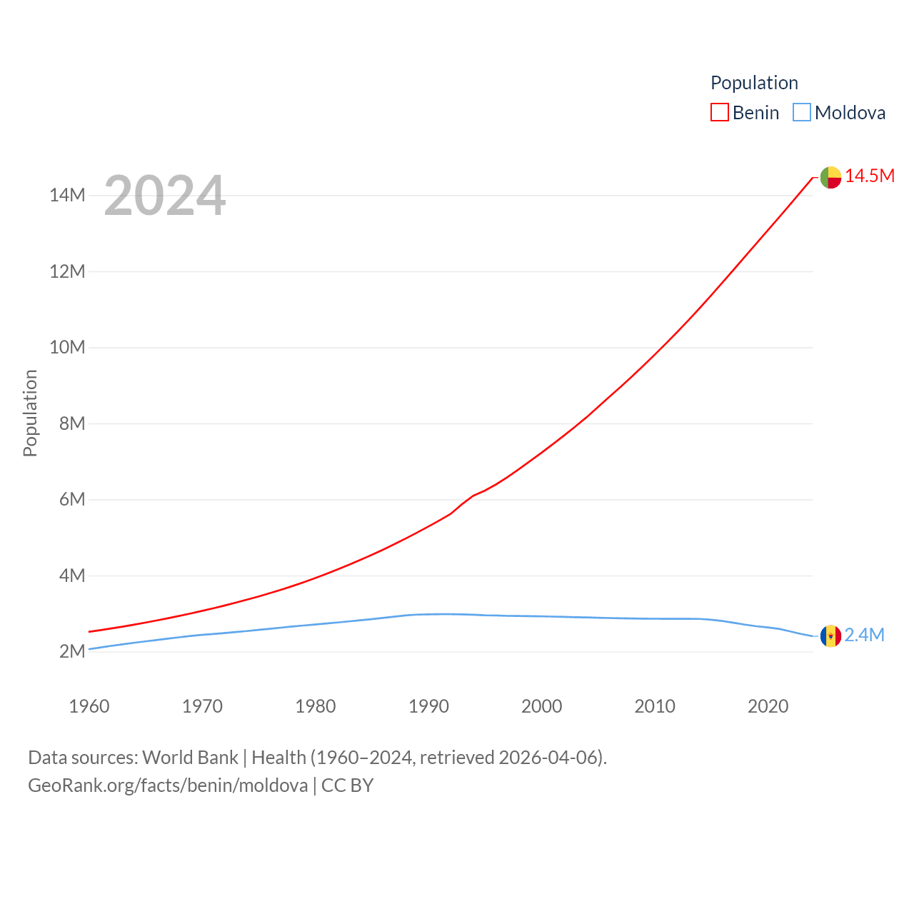 Benin has a population of 14.5M (ranked 76/197), compared with 2.4M in Moldova (ranked 143/197). Benin's land area is 43,537 sq mi versus 12,714 sq mi for Moldova (ranked 99th vs. 135th).