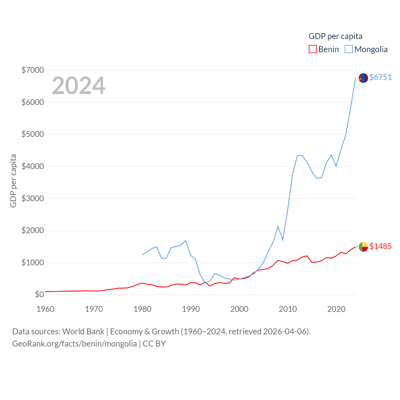 By GDP, Benin ranks 126/197 ($21.5B) and Mongolia ranks 121/197 ($23.8B). By GDP per capita, Benin ranks 162/197 ($1,485), while Mongolia ranks 105/197 ($6,751).
