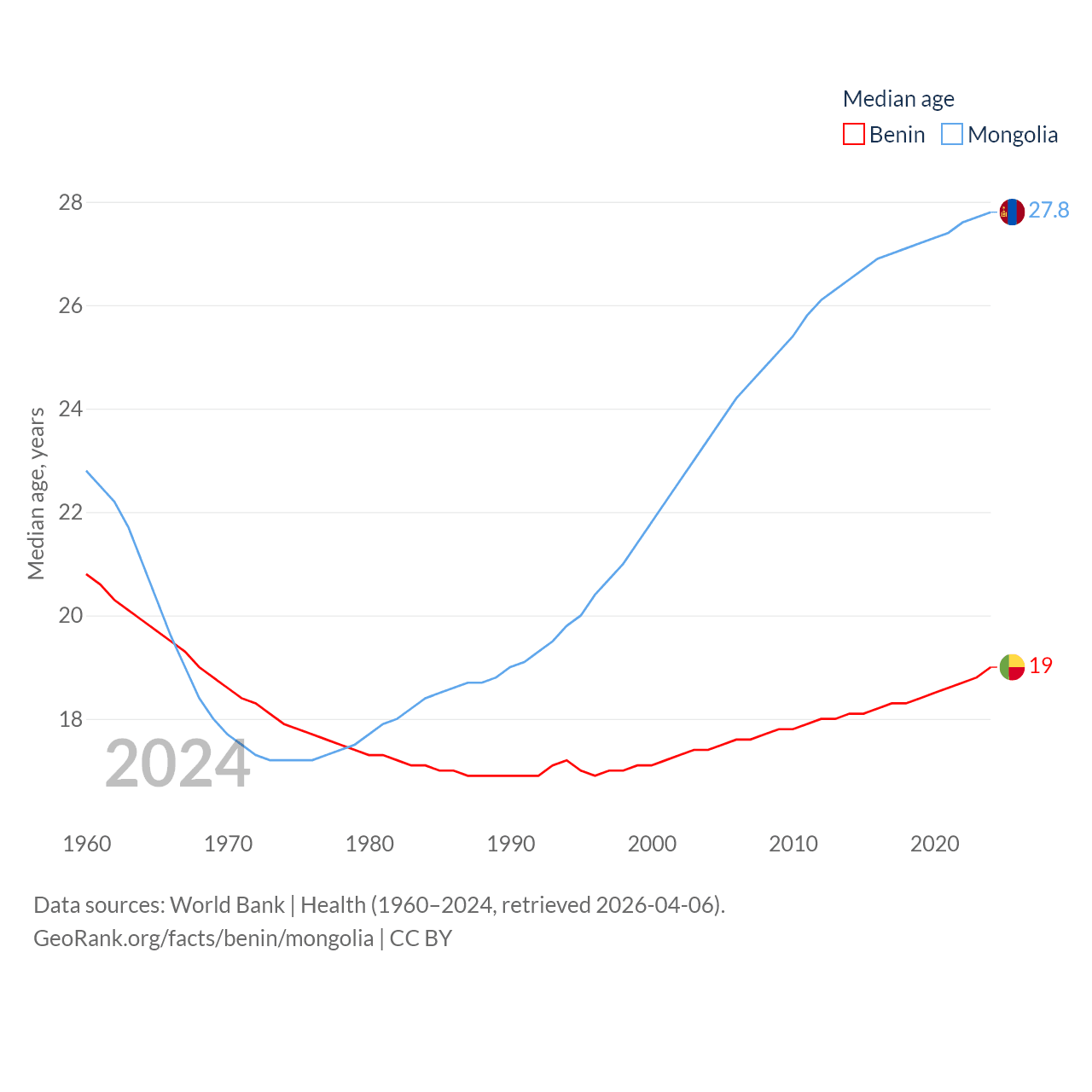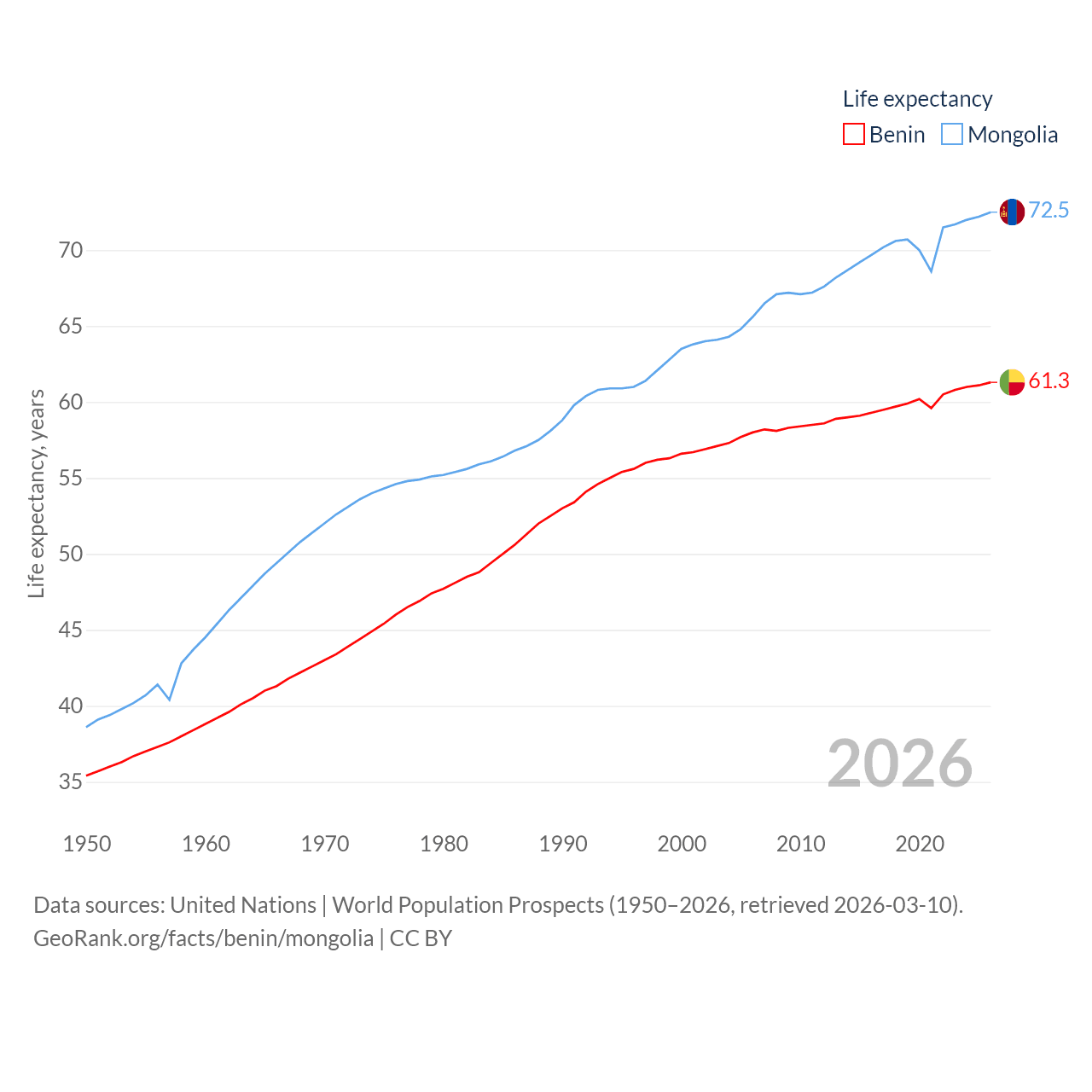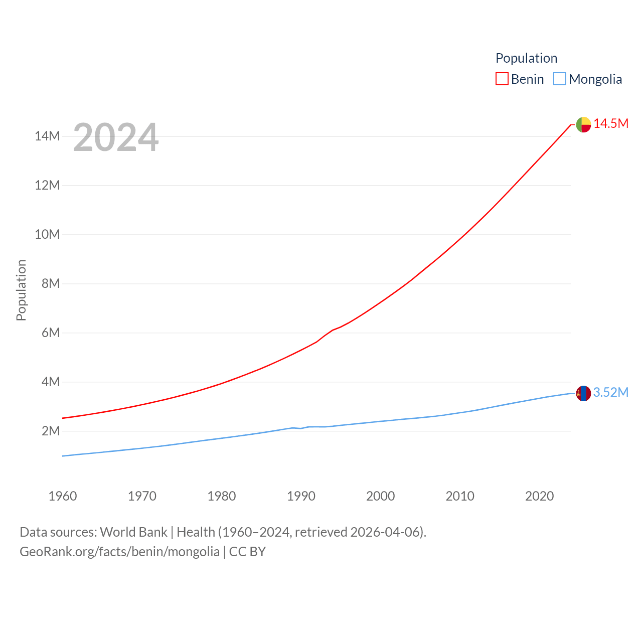 Benin has a population of 14.5M (ranked 76/197), compared with 3.52M in Mongolia (ranked 132/197). Benin's land area is 43,537 sq mi versus 601,740 sq mi for Mongolia (ranked 99th vs. 18th).